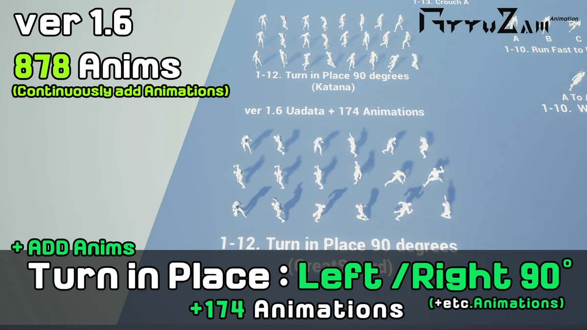 The pack contains approximately 998 key animations covering both Katana and Great Sword styles. These animations are divided into various categories to support diverse gameplay mechanics. For example, the set includes 166 in-place movement animations and 145 Root Motion sequences. Additionally, the developer has included 124 turn-in-place animations for both Root Motion and in-place configurations.