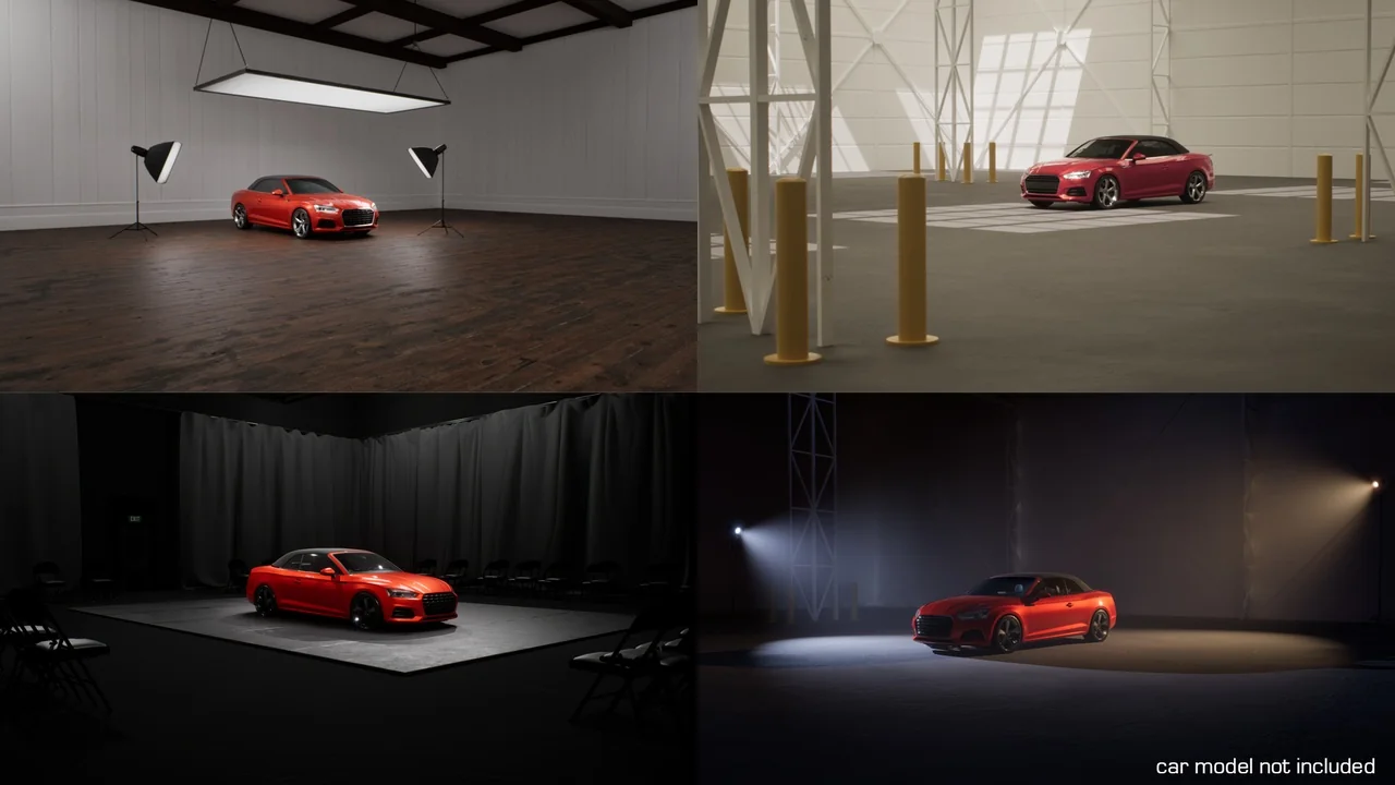 The included lighting scenarios are specifically optimized for portrait, product, and automotive work. Furthermore, the developer has included three photorealistic background environments to enhance your scenes. These environments include an Apartment, a Blackbox Theatre, and a Concrete Warehouse. Specifically, the warehouse environment features both day and night variations for diverse photographic backgrounds.