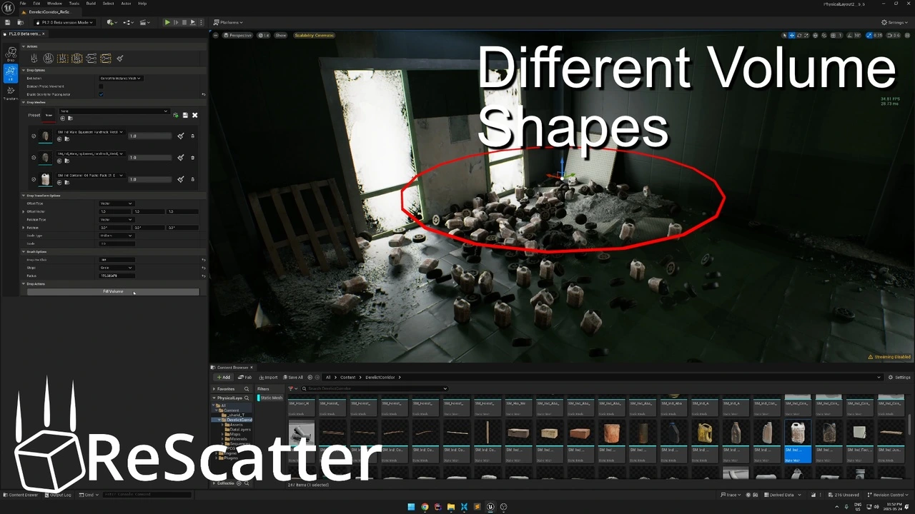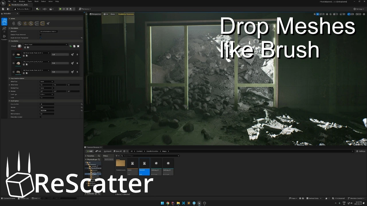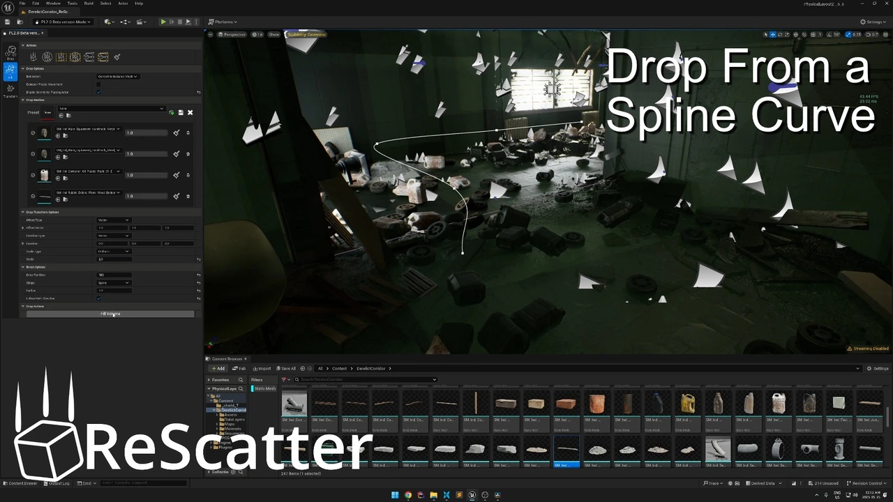 From the creator of the massively popular “Physical Layout” tool, downloaded over 200,000 times, comes its powerful and completely rebuilt successor: ReScatter. We listened to your feedback, learned from the past, and engineered a brand-new tool from the ground up using Unreal Engine’s modern interactive UI framework and the powerful Chaos Physics engine.