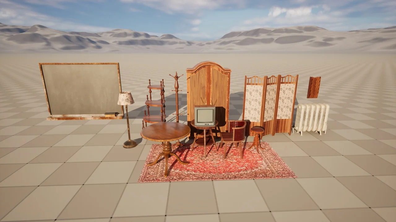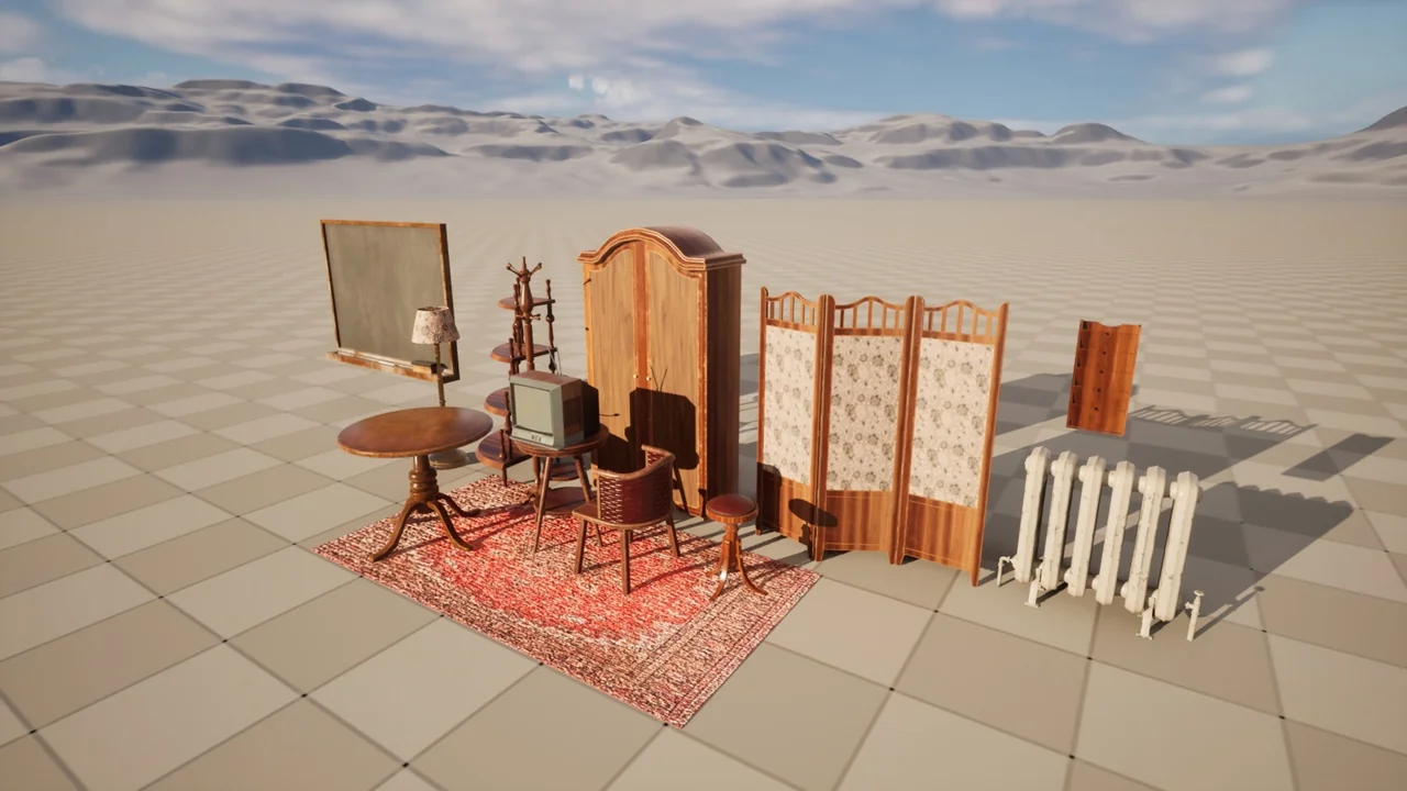 The set contains a total of 16 unique items. These assets cover the essential needs of a retro interior. For instance, you will find sturdy wooden tables and classic chairs. Furthermore, the set includes large wardrobes and functional shelves. These pieces help define the layout of a room. Additionally, smaller details like antique lamps and blackboards add character. Finally, the included carpet assets tie the whole interior together.