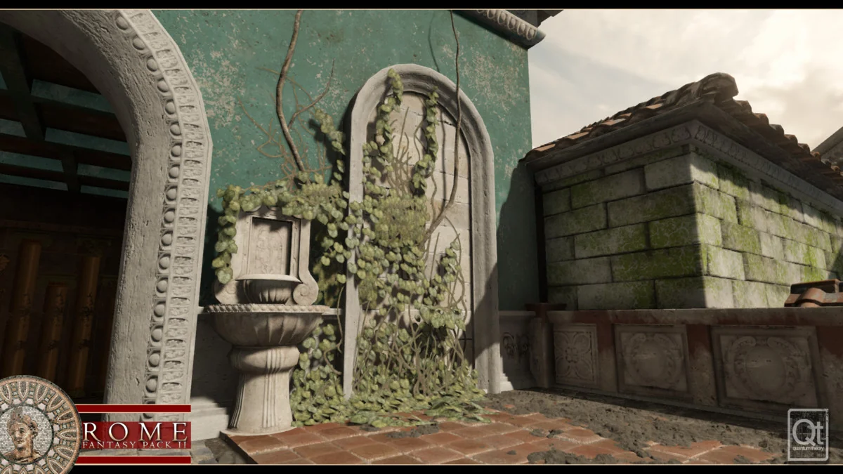 The pack utilizes shaders compatible with the Amplify Shader editor, allowing users to inspect and adjust the logic behind surface effects. These shaders support various environmental states, such as wetness, stains, and decals. For specific localized detailing, puddles can be painted directly onto surfaces using vertex colors. To help ground the architecture in its historical setting, the creator included over 100 fresco and frieze decals. These can be applied to the modular walls to provide the cultural detailing necessary for an authentic Roman aesthetic.