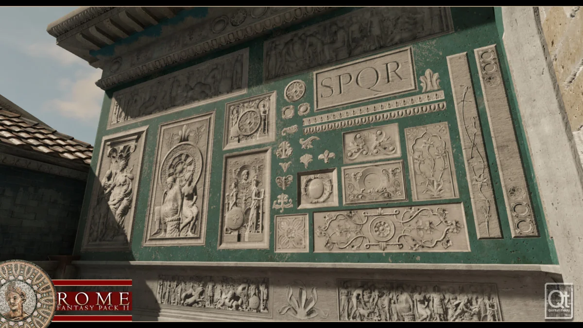 The visual quality of the pack is driven by a workflow that avoids photo-sourced textures. Instead, materials are authored through Substance Designer and Substance Painter. This approach eliminates the blurriness and high-contrast artifacts often associated with double-compressed photo data, resulting in sharp, clean material data for the engine. The set includes custom-made Roman frescos and mosaic art, many of which are based on real-world historical counterparts. These are supported by high-poly sculpts used to generate clean, artifact-free normal maps for props and architectural elements.