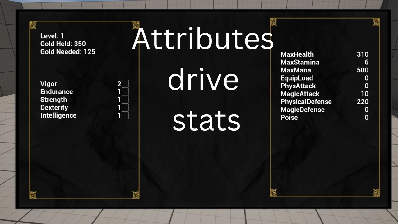 This system draws inspiration from games like Souls, where attributes drive other stats. For instance, upgrading Vigor can increase max HP by 500 and carry capacity by 200. The system offers full granular control over which stats to increase and by how much. It also includes equipment and inventory to demonstrate how to add stats via weapons, armor, and consumables.