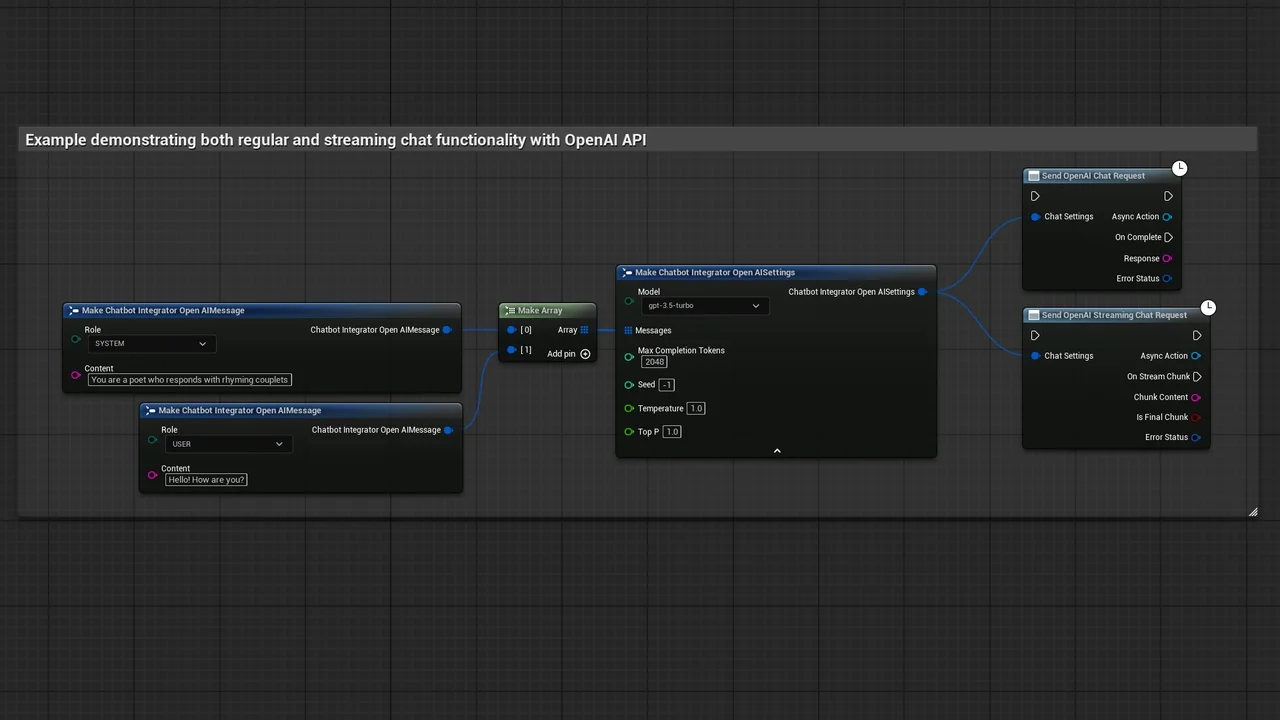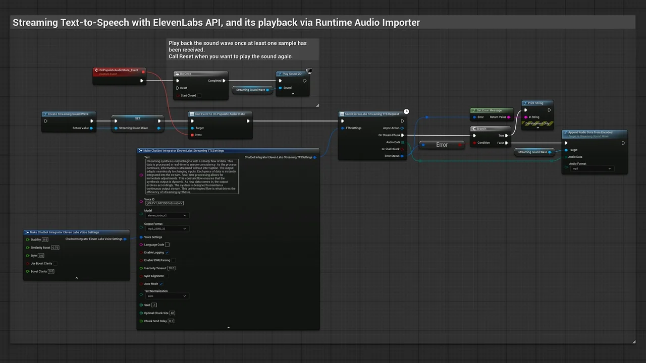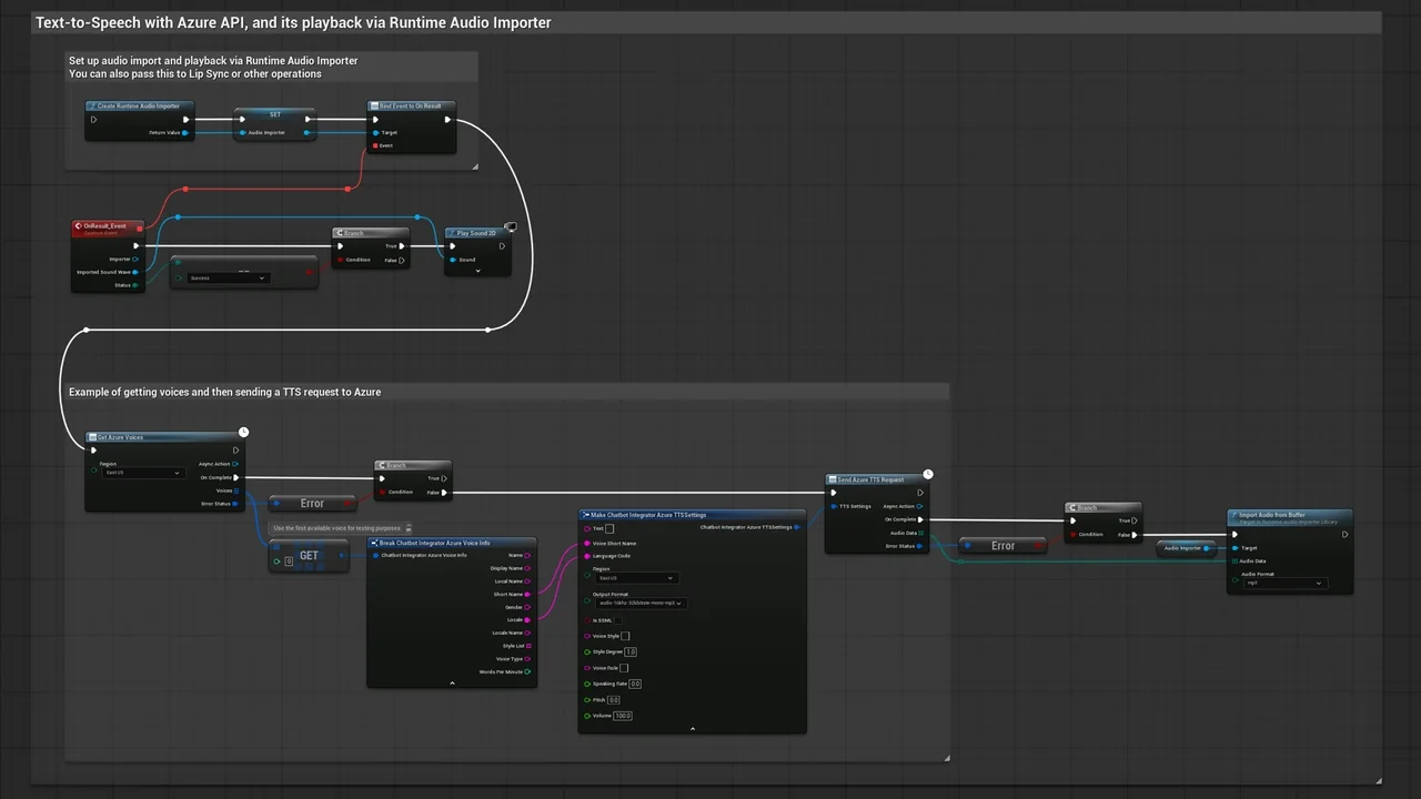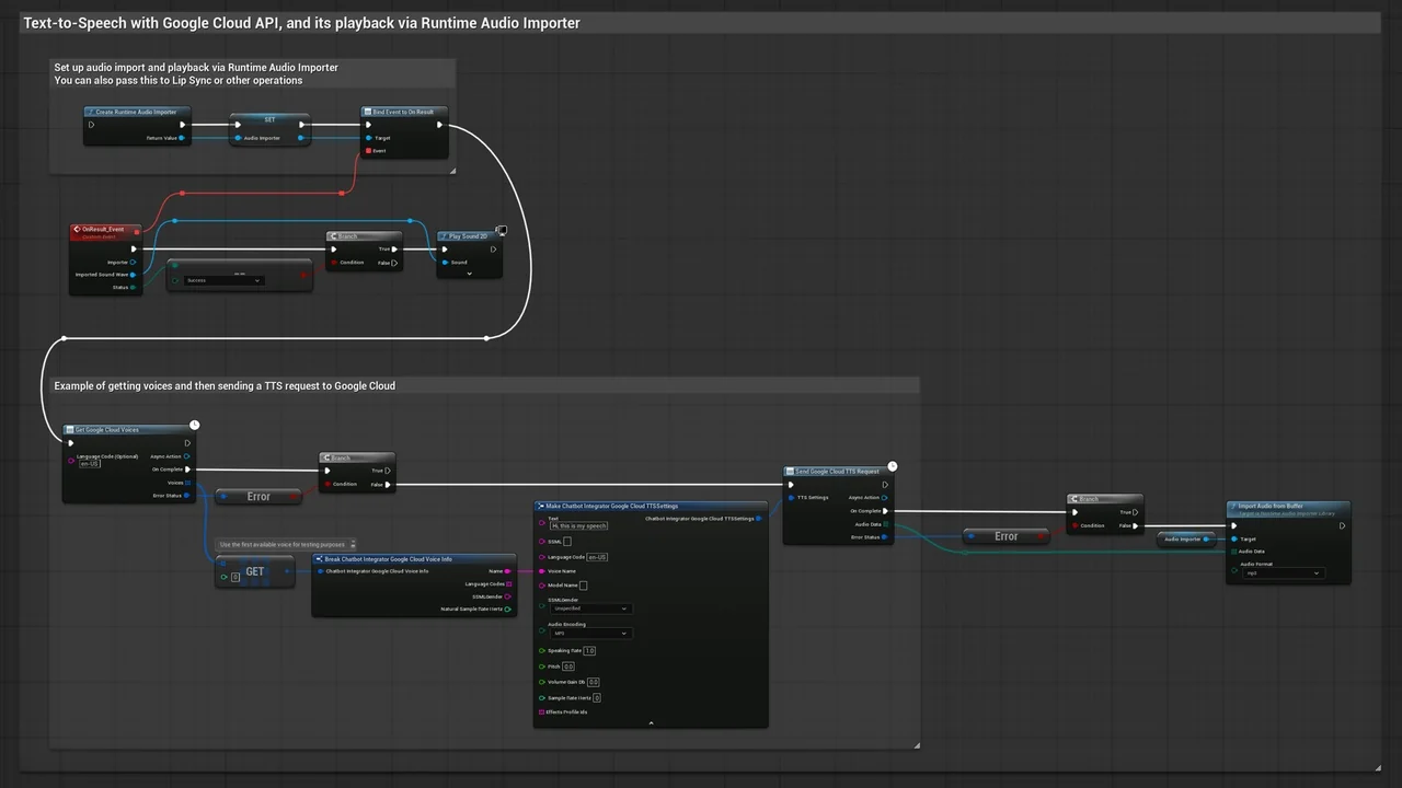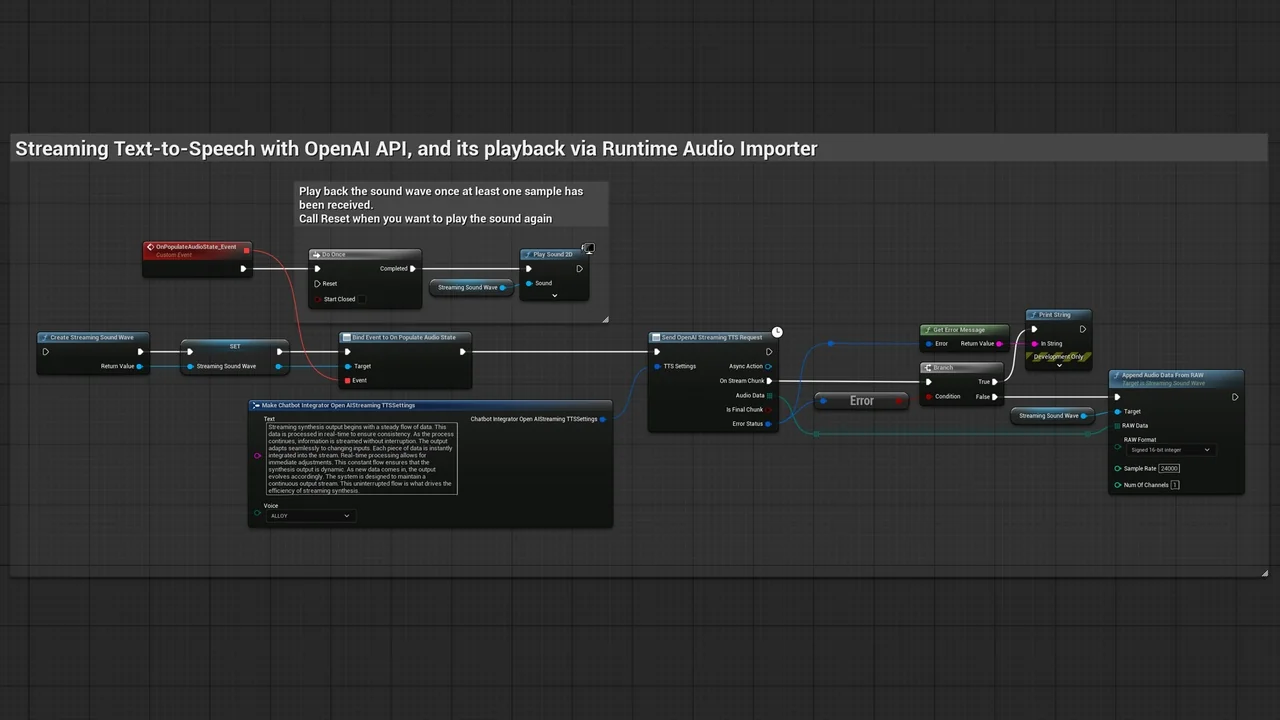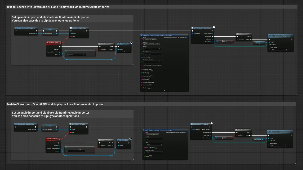 Note that the images and examples for text-to-speech were created using the Runtime Audio Importer plugin. To follow those specific examples, you will need to install that additional plugin. However, you are free to implement your own audio handling solution if preferred. For standard text-to-text functionality, the additional importer is not required.