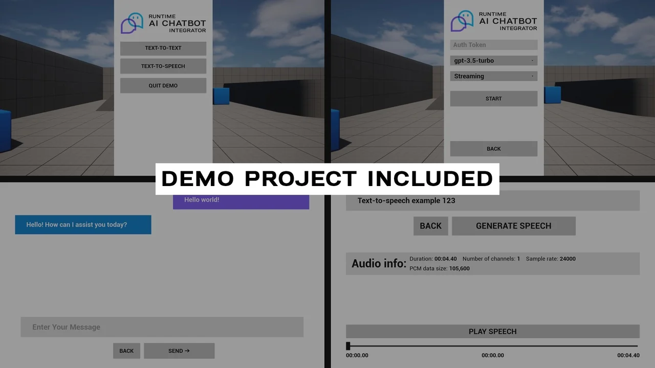 The Runtime AI Chatbot Integrator (+TTS) is built for versatility across multiple environments. It works on all platforms supported by Unreal Engine, including Windows, Mac, Linux, Android, and iOS. Additionally, it is compatible with VR platforms like Meta Quest. Authentication is simplified through an easy API key management system for all integrated services.