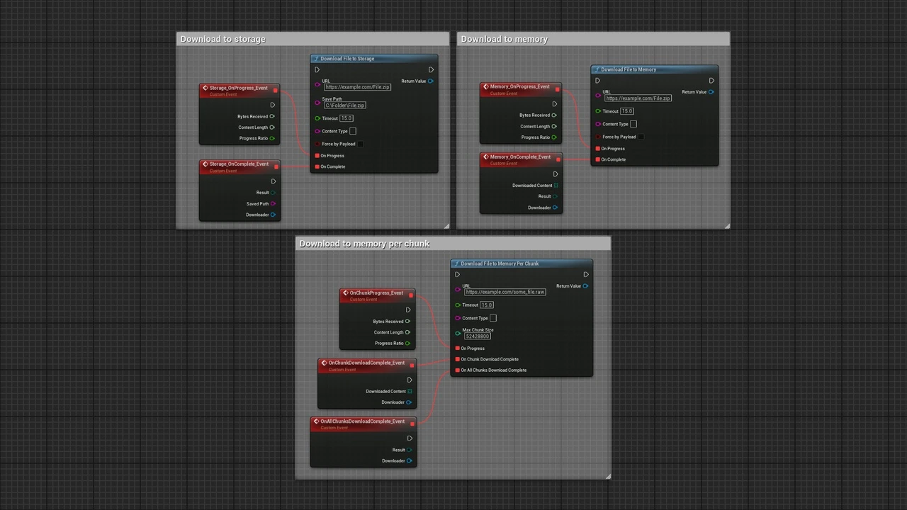 The plugin supports downloading content larger than 2GB, unlike the standard UE implementation. It extends the file size limit beyond UE’s 2GB constraint using a signed 64-bit integer limit. The chunk-based content downloading approach ensures no third-party libraries or external dependencies are required, and it offers cross-platform compatibility (Windows, Mac, Linux, Android, iOS, etc.).