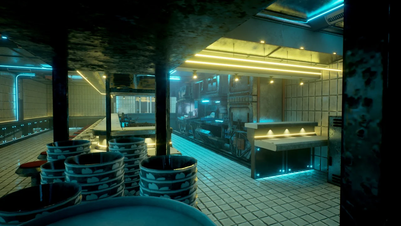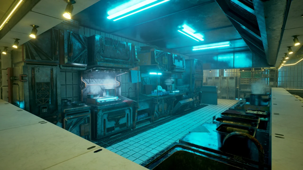 The developer has optimized the Sci-Fi Kitchen for modern workflows in Unreal Engine 5.0 and above. It fully supports Nanite and Lumen technologies. Consequently, these features allow for highly detailed geometry and dynamic global illumination. The package also includes a finished demo map with cinematic lighting. This map allows users to see the assets in a professional, polished environment immediately.