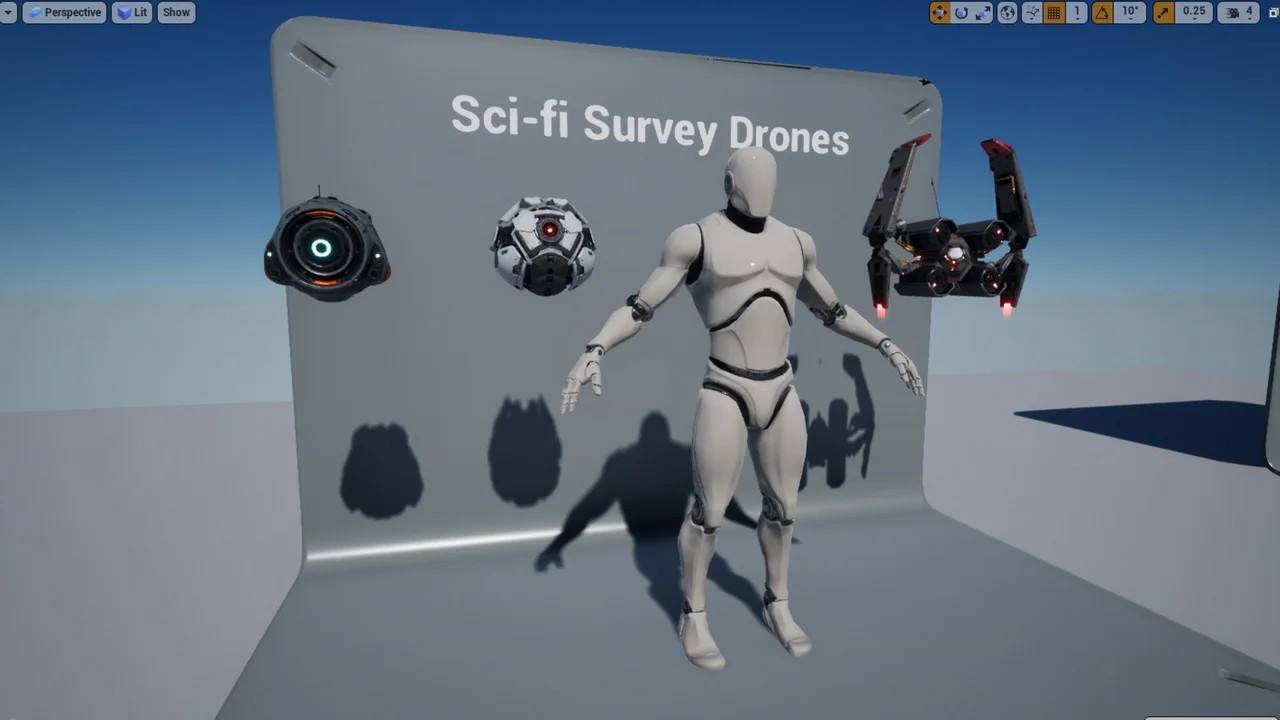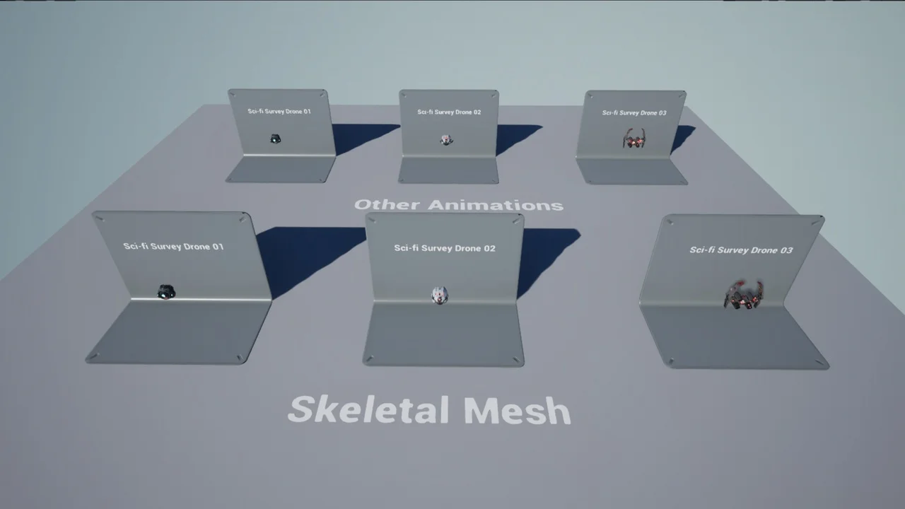 A set of 3 high quality Sci-fi Surveillance Drones for your next AAA-Game. That can be used as a companion for a player or enemy NPC including Sonar Scan vfx Features and Blueprint Classes.