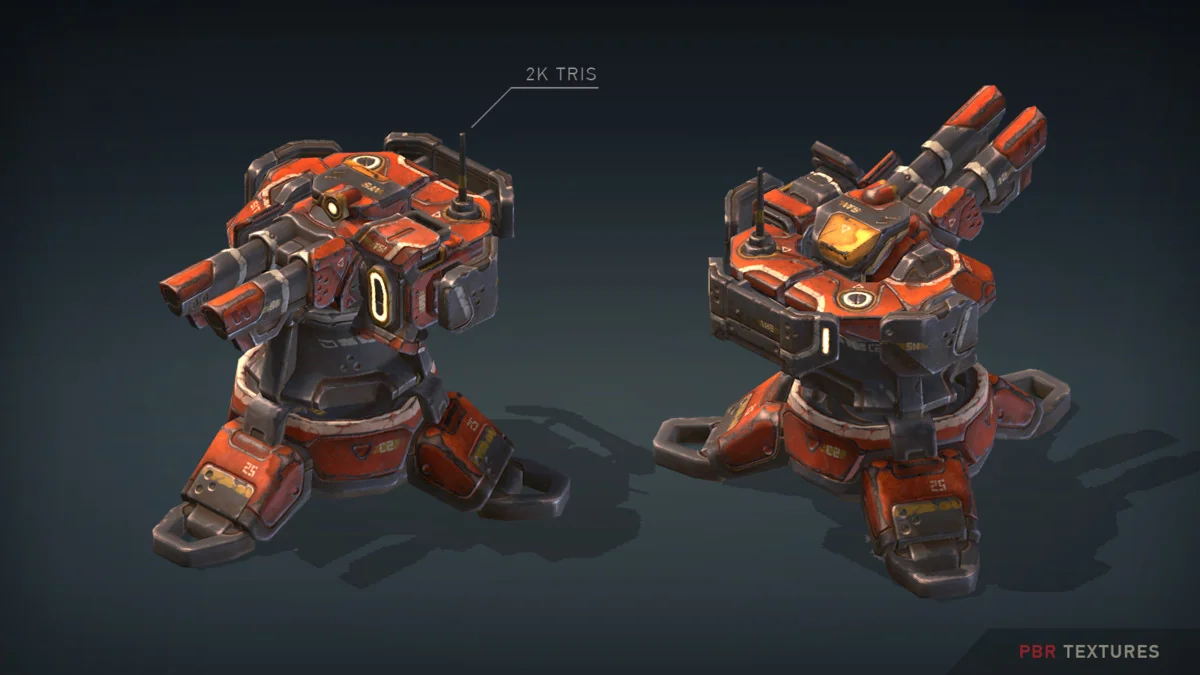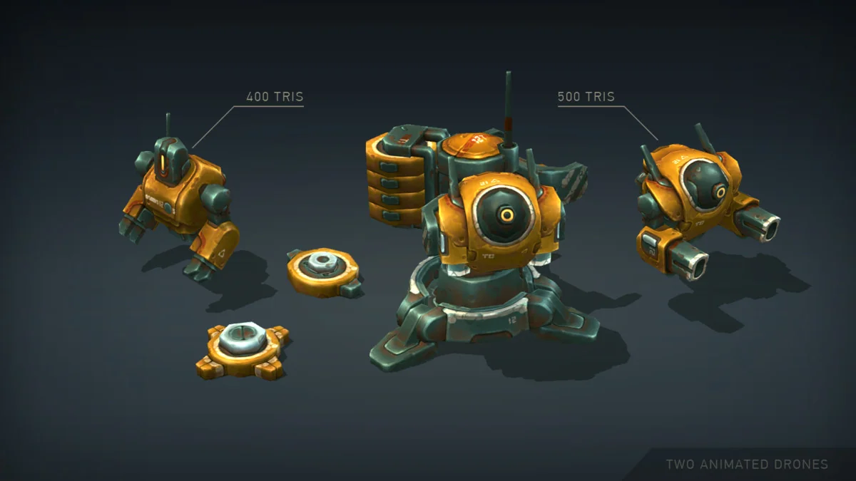 The asset is optimized for performance across different rendering requirements. Poly counts for the individual units range between 500 and 3,000 triangles, making them suitable for scenarios requiring multiple active units on screen. All parts in the package are mapped to a single 4k texture atlas, which can be downsized to 2k if lower memory footprints are necessary.
