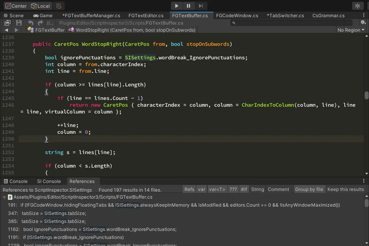 Replace in Files is paired with global Undo/Redo afterward, which helps when a batch change needs to be reviewed or rolled back. The editor also provides unlimited and independent undo and redo buffers per asset, so edits can remain separate even when several files are open at once. Quick call-stack navigation to Console log entries gives one more route back into the code from runtime messages, which is useful when a log entry points to a specific path through the project.