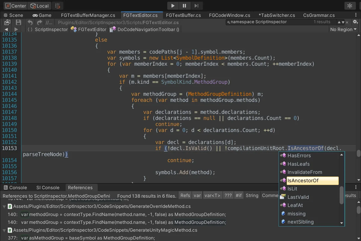 C# work gets context-sensitive auto-completion and automatic code completions, the familiar IntelliSense-style support that helps while typing methods, fields, and references. Script Inspector 3 also includes customizable code snippets, giving teams a way to reuse small blocks of structure without rebuilding them every time a file is opened.