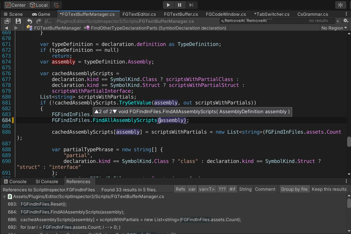 Navigation tools cover a wide range of common tasks. Script symbols and #region navigation make it easier to move through structured code, while Go To Definition and Find All References with filtering help trace where something comes from and where it is used. Cursor history navigation keeps the editing trail available, and Search, Quick Search, Find in Files, and Replace in Files with preview and selections cover the broader project lookup side.