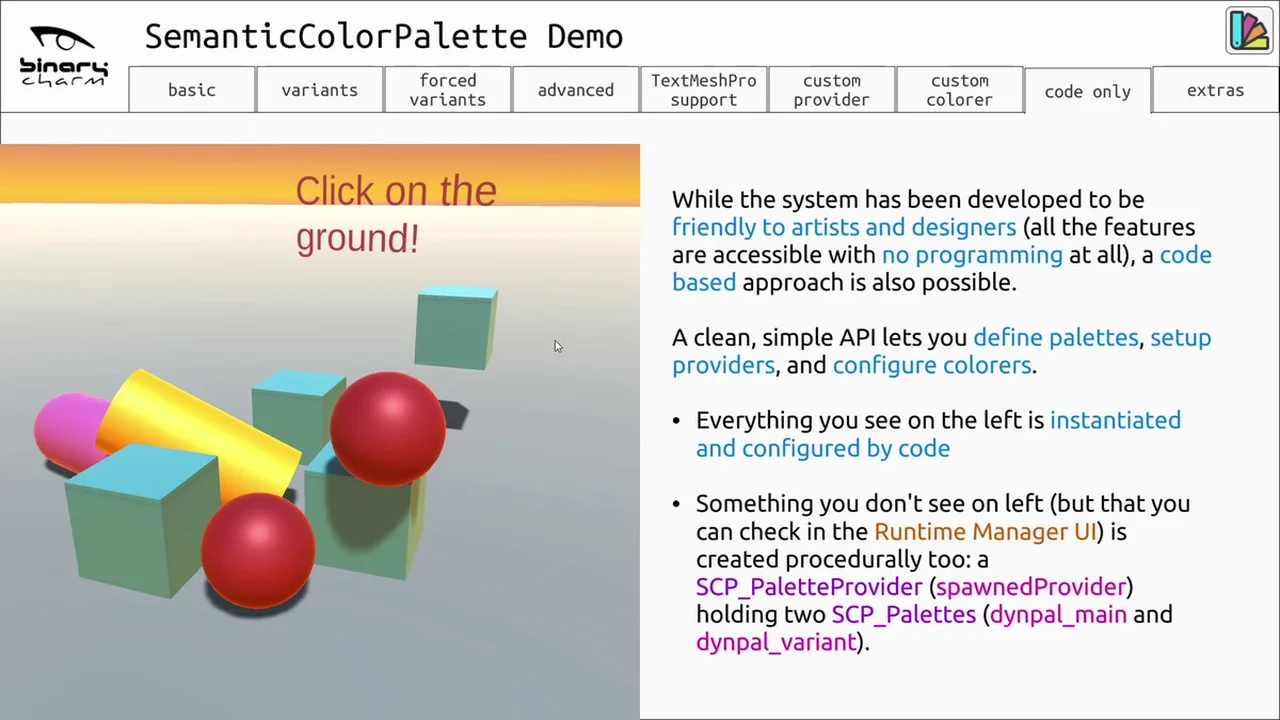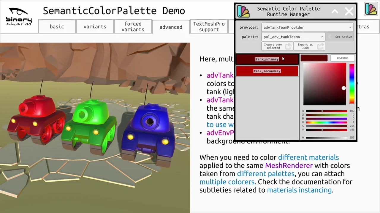 Ready to use Colorers for Unity components using color properties (UI elements, Materials etc) are included. That said, programmers can easily extend the system with additional custom colorers (and providers).