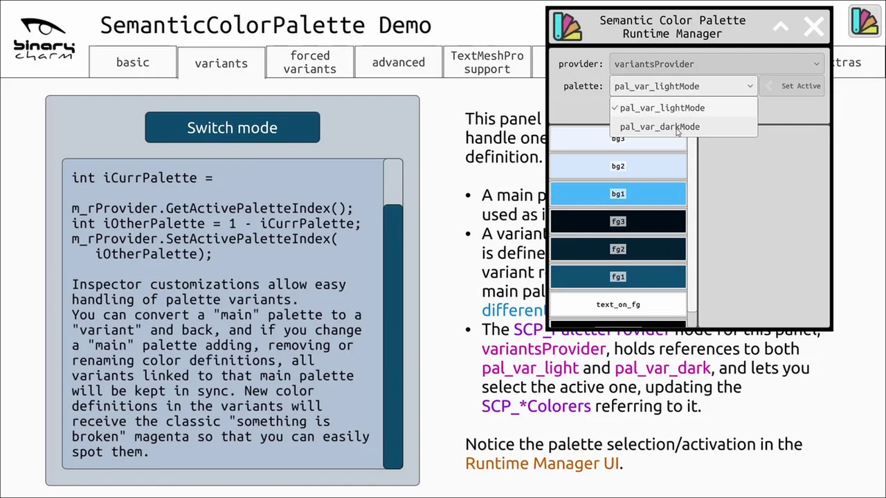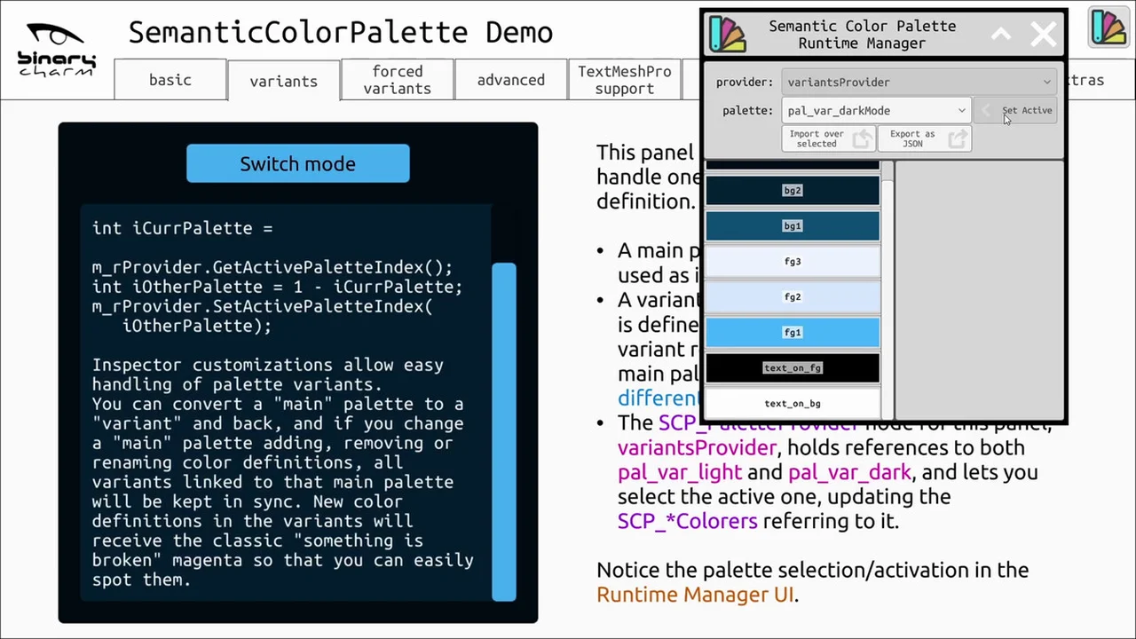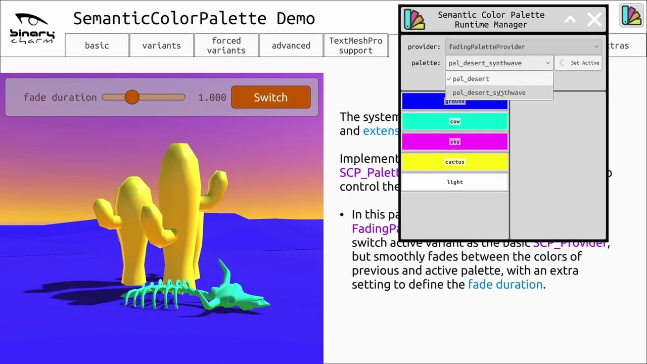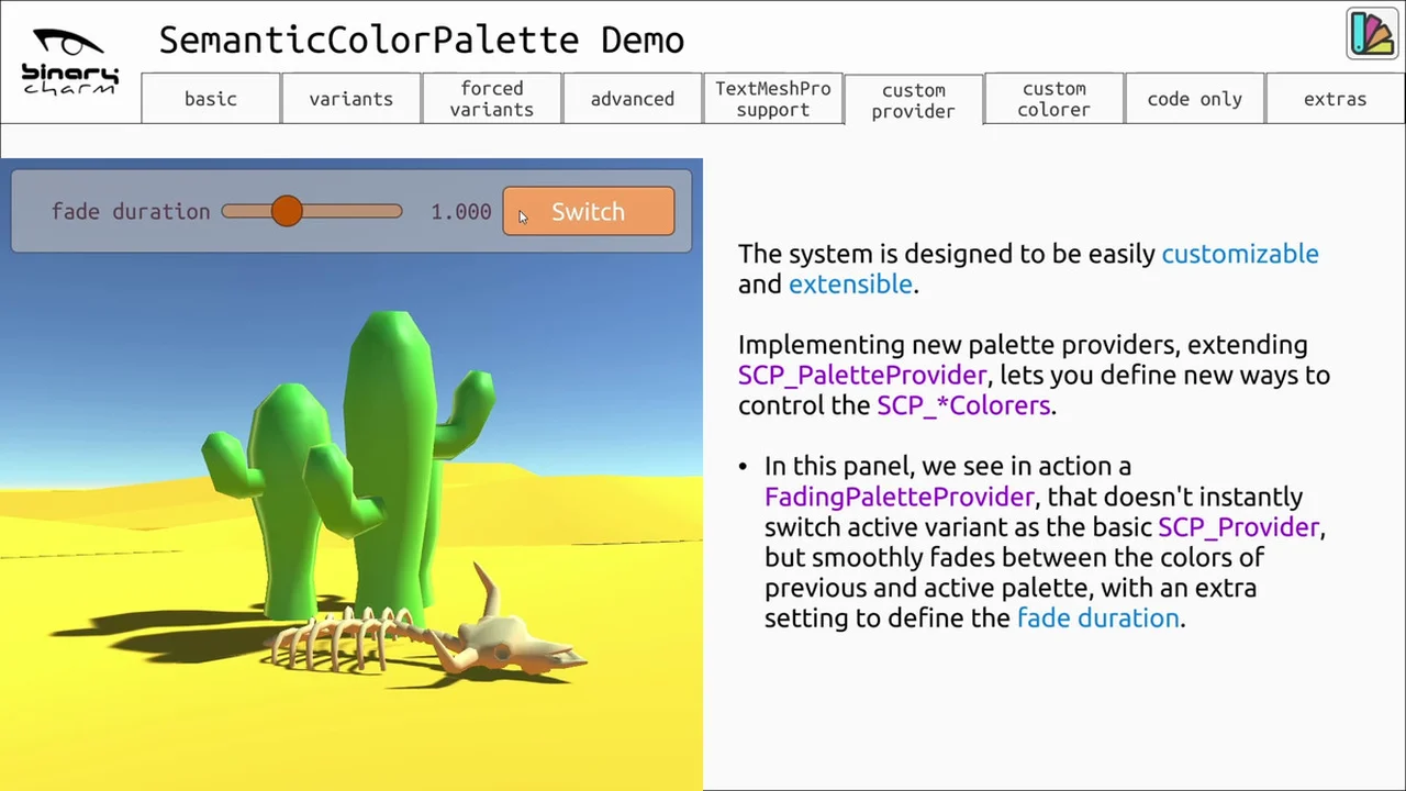 - Palette provider: an active element, living in a Unity scene, that acts as a broker between palettes and colorers, pushing color updates to any relevant colorers.