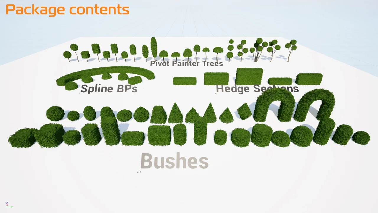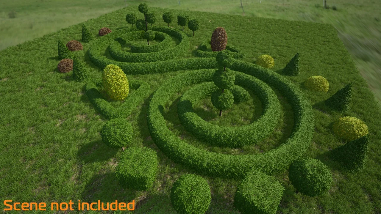 The set contains a wide range of shaped bushes and small trees. For instance, you can find various geometric shapes that are common in formal landscaping. These assets allow you to create beautiful, manicured gardens with ease. In addition, the variety ensures that your scenes do not look repetitive or unnatural.
