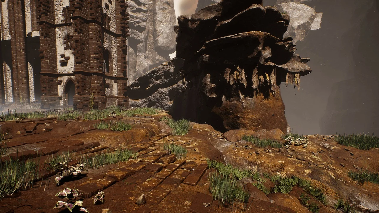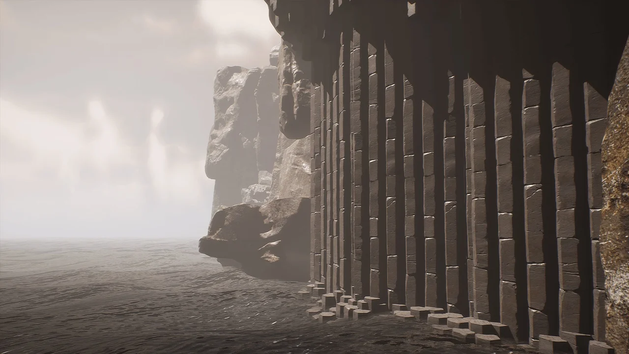 Sharur’s Lost Monastery Ruins excels at blending architecture with natural surroundings. The pack features a variety of terrain assets like cliffs, rocks, and basalt columns. Furthermore, the inclusion of ground pebbles and smaller stones adds a layer of ground-level detail. These assets work together to create a believable, weathered landscape around the monastery.
