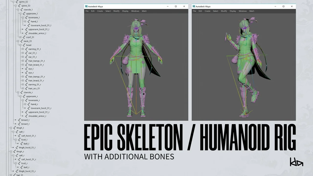 - Rigging: Epic Skeleton (UE4) with additional bones.