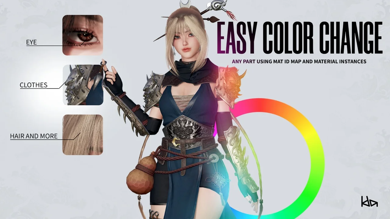 The asset features professional 4K textures for maximum visual clarity. These sets include maps for BaseColor, Normal, Roughness, Metallic, and Ambient Occlusion. Additionally, the developer included Material ID maps for the skin, eyes, hair, and outfit parts. These maps are incredibly useful for changing colors quickly. By using the included Material Instances, you can customize the character’s color palette without editing the base textures.