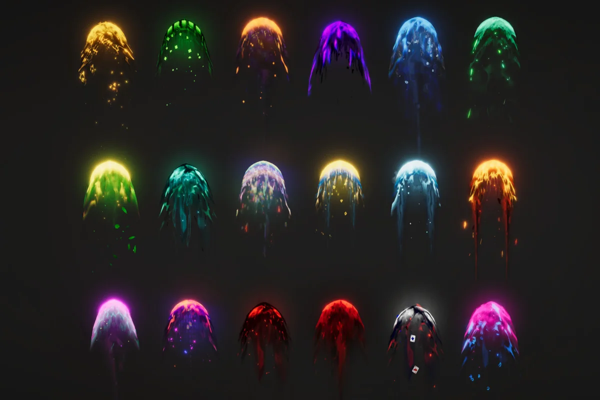 A single shader is used for all particles. That keeps the visual system consolidated instead of spreading the effects across multiple shader setups. The package also includes 116 materials, 103 textures, and 6 models used only in particles. Alongside the VFX prefabs, this creates a self-contained set of supporting assets for the particle presentation.