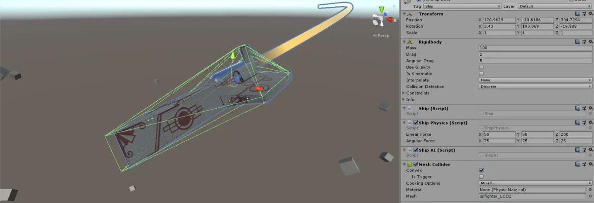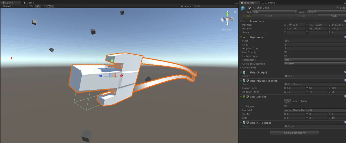 Spaceship AI is a scripting implementation designed to handle the complexities of flight within a physics-driven environment. Rather than relying on simple transform-based movement, the system drives a Rigidbody physics ship model. This approach ensures that the ships interact naturally with the game world’s forces, providing a sense of weight and momentum essential for space or flight simulations.