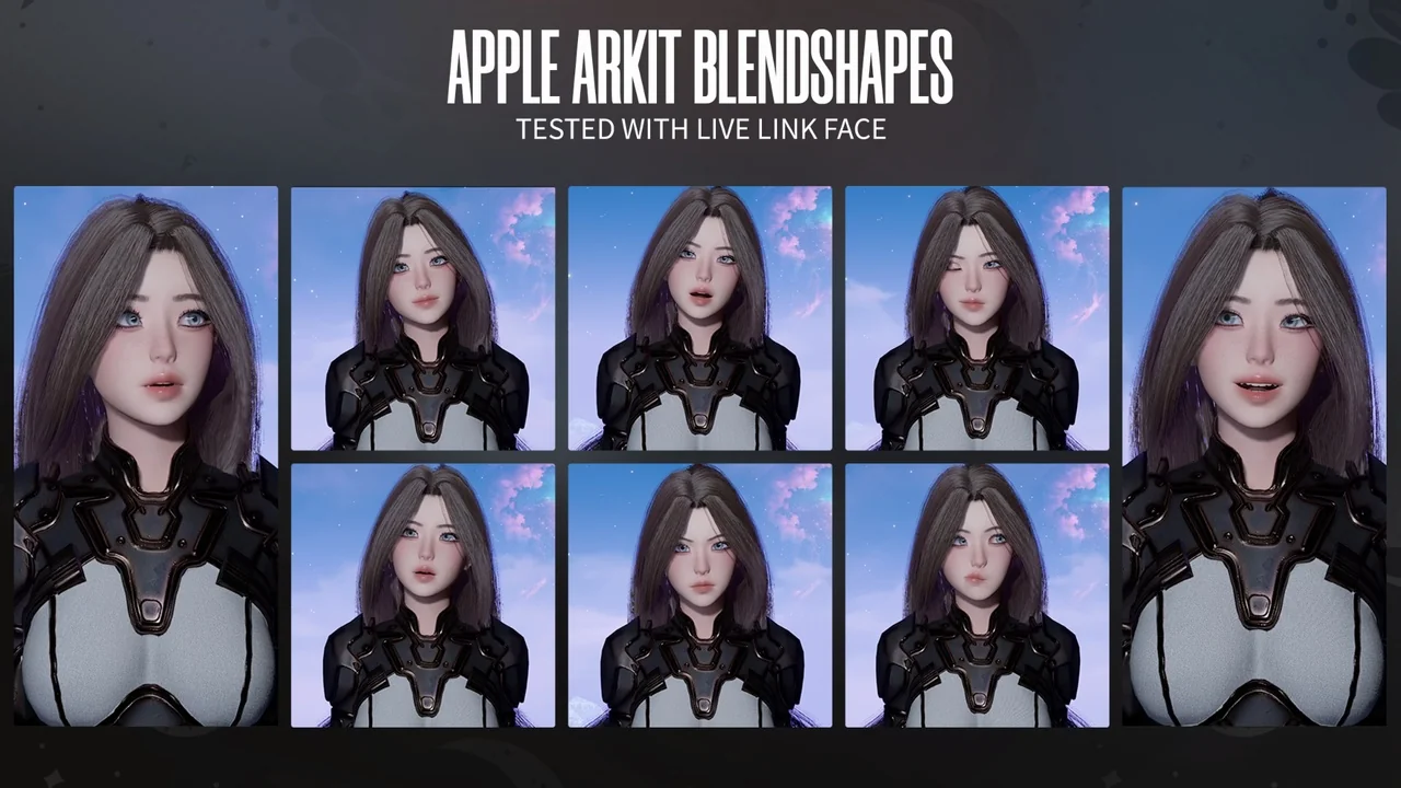 Stellar Girl Celeste is fully equipped for facial animation. She features 52 perfectly calibrated Apple Blendshapes. These shapes are designed for use with Live Link Face in Unreal Engine. As a result, you can use this character for live streaming, VTubing, or high-fidelity facial performance capture. Meanwhile, the setup also works seamlessly with other facial mocap software.