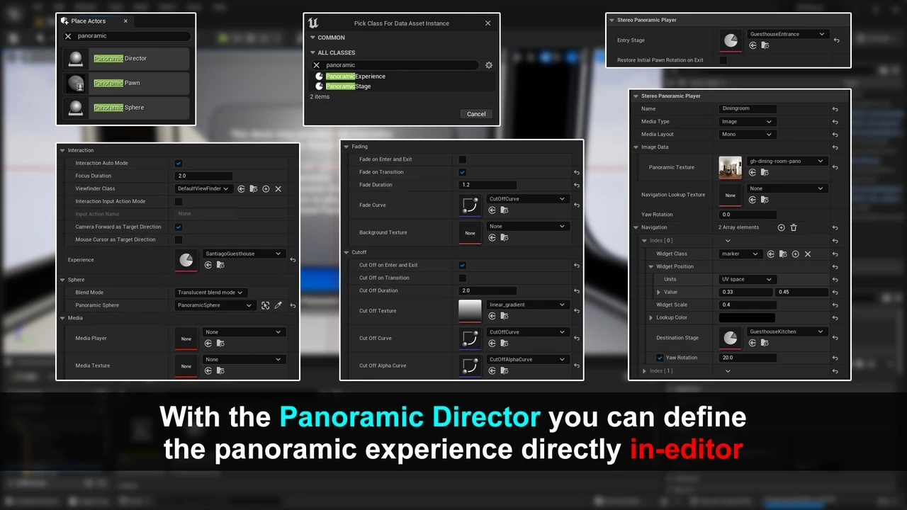 360 Stereo Panoramic Player is a runtime plugin to show and interact with 360° panoramic images and videos, supporting both mono and stereo sources. It offers an high-level actor (Panoramic Director), to quickly assemble an interactive panoramic 360 Virtual Tour, and a low-level actor (Panoramic Sphere) to allow a programmatic customization of the user experience. It’s compatible with all the major platforms and it’s actively tested on PC, VR (Steam, Oculus, Quest, Cardboard, etc.), iOS and Android.