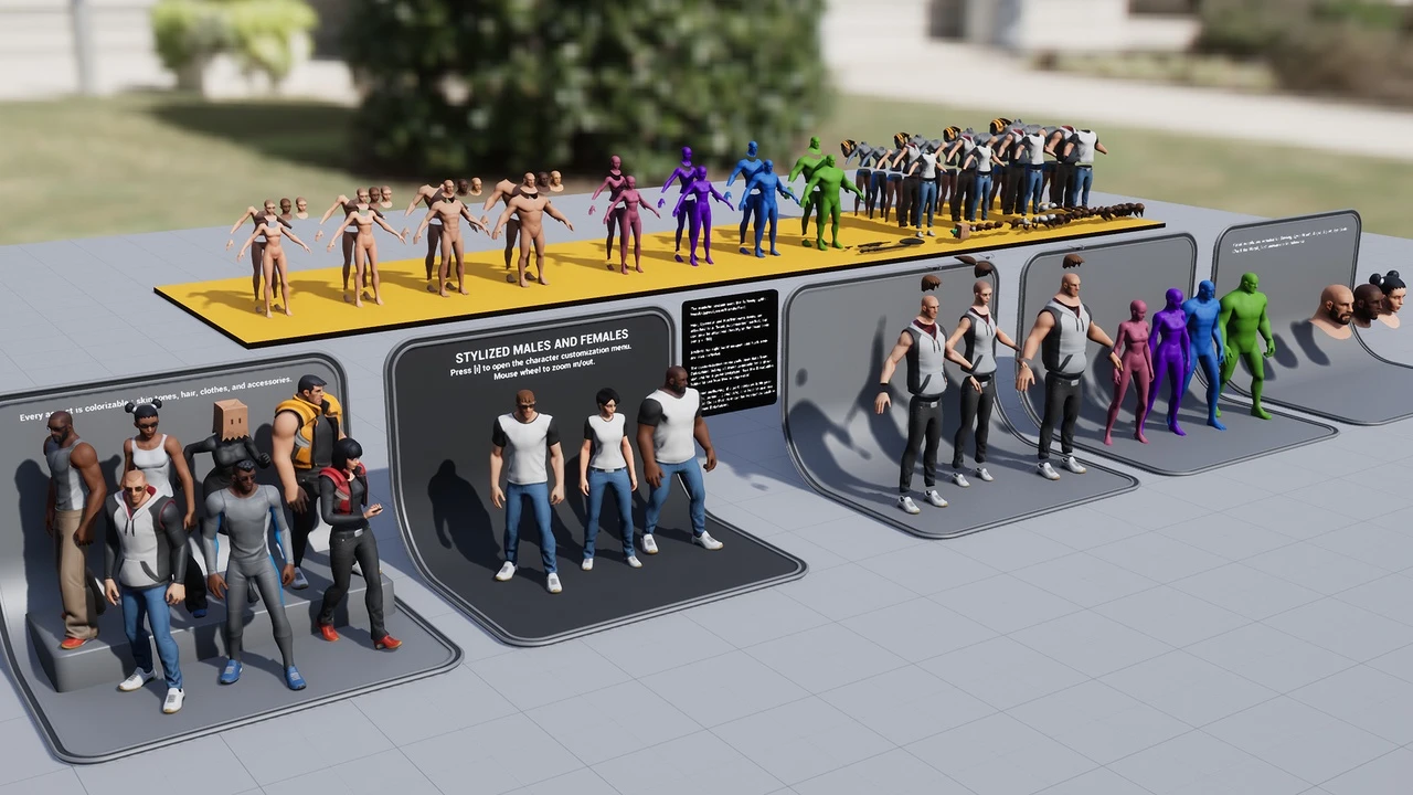 9 variants : UE4 Male, UE4 Female, UE4 Tall Female, UE4 Buff Male, Tall Metahuman Male, Tall Metahuman Female, UE5 Lyra Male, UE5 Lyra Female, UE5 Lyra Buff Male. The character items are split as head/upper/lower/hands/feet.