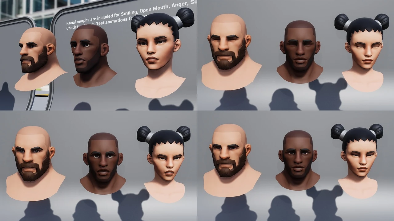 This bundle of stylized characters includes modular bodies, ethnic heads (White/Black/Asian), clothing pieces, hair styles, accessories. Built on the Epic skeleton (UE4 and UE5).