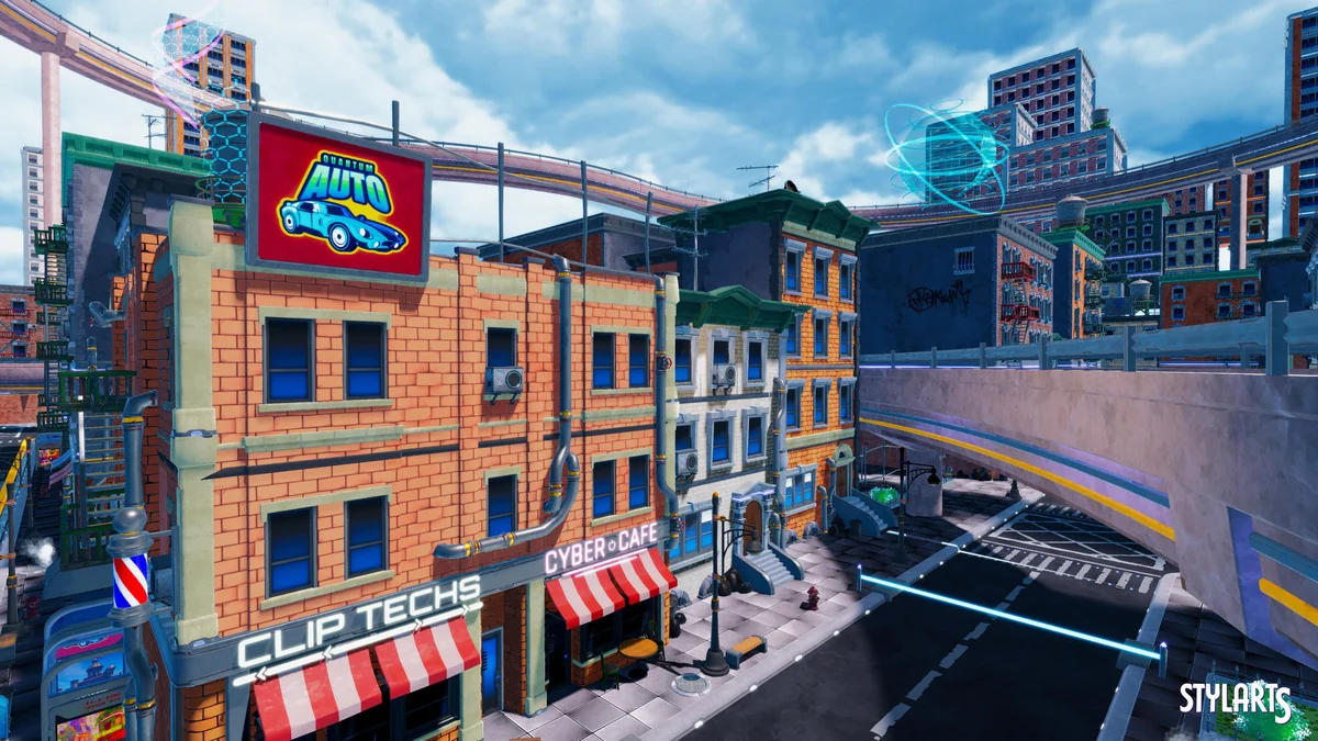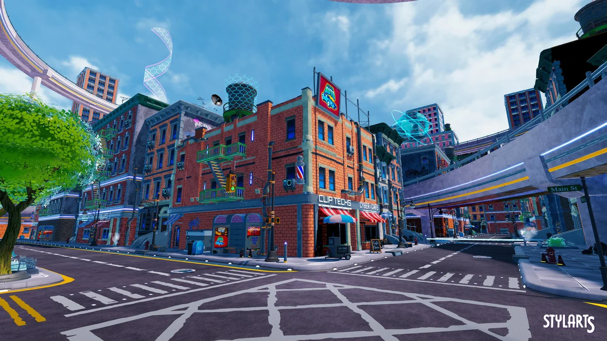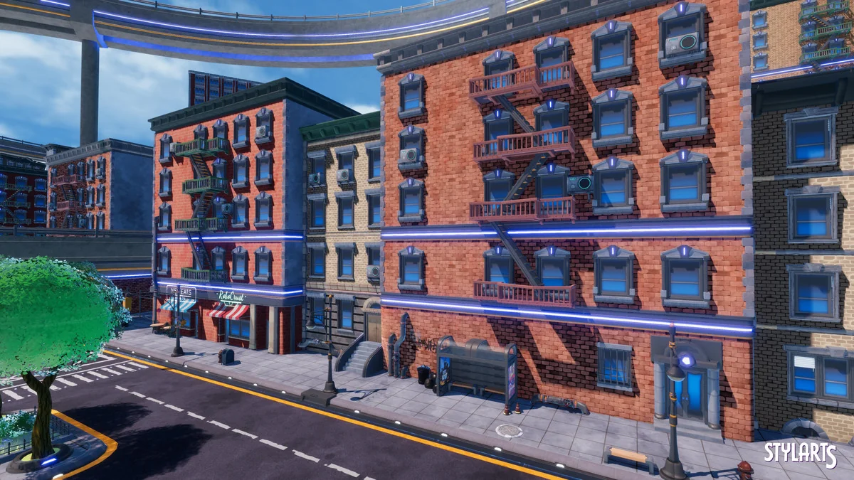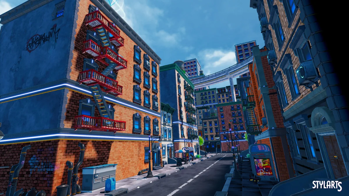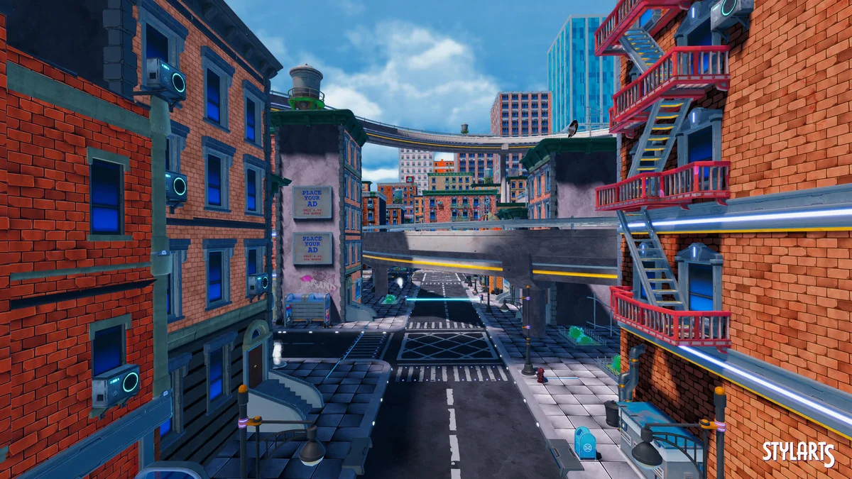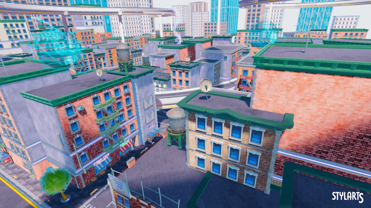 The Stylized Sci-Fi Modern City package is centered around a modular construction system designed for rapid environment iteration. With 136 unique meshes, the toolkit allows for the assembly of complex urban layouts by combining architectural components such as buildings, streets, bridges, and stairs. The modular nature of the set is intended to let developers move quickly between mesh placement and material adjustment, facilitating a workflow where the broad strokes of a city level can be established before moving into the polishing phase.