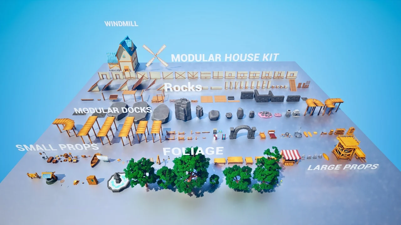Stylized Village includes 248 meshes for building fantastical stylized worlds. That number matters because it places the asset somewhere between a minimal scene kit and a broad environment library. A mesh count at this scale suggests the environment is not relying on only a handful of repeated landmark pieces. It is intended to assemble a fuller world with enough variety to support the island, town, and surrounding biomes.