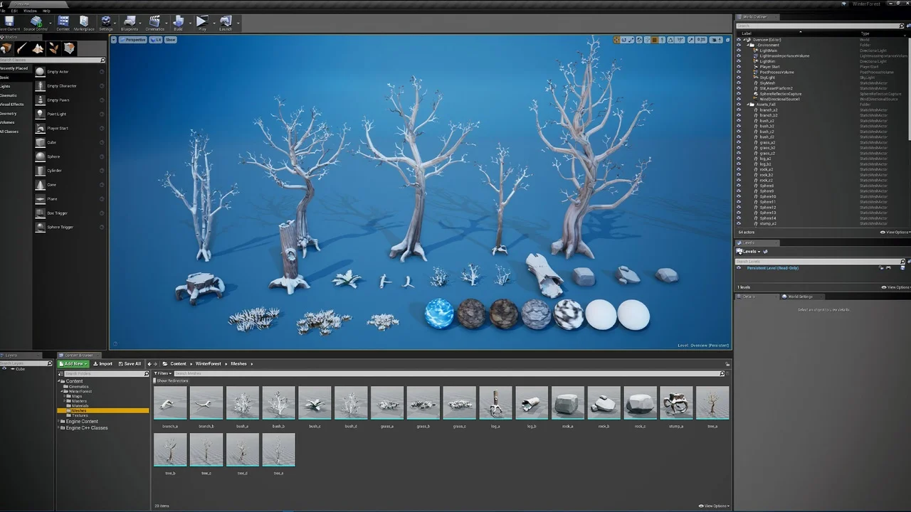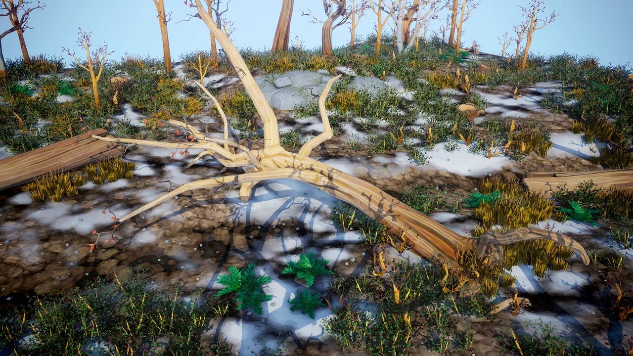 This pack includes 20 game-ready environment meshes, 20 materials instances, 3 example terrain material instances (fall, winter, and auto-cliffs), a world-aligned snow effect for adding snow on top of any mesh, and various presets for maximum control and customization. The included terrain master materials make it easy to customize and add your own textures for unlimited variations on your landscapes.