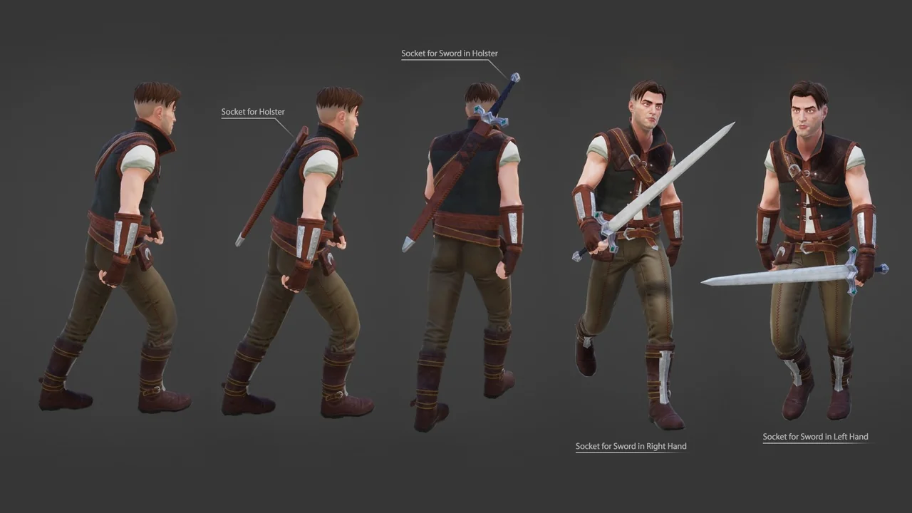 A swordsman is only as good as his equipment. This package includes a detailed sword and a matching holster. These are provided as separate objects for better control. Moreover, the character features four pre-configured sockets. These sockets are placed in strategic locations on the body. They allow you to attach the sword or other gear instantly. Consequently, you can handle weapon switching or sheathing with ease. This setup simplifies the technical side of character inventory systems.