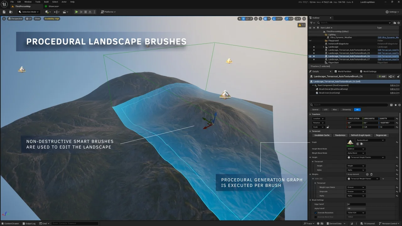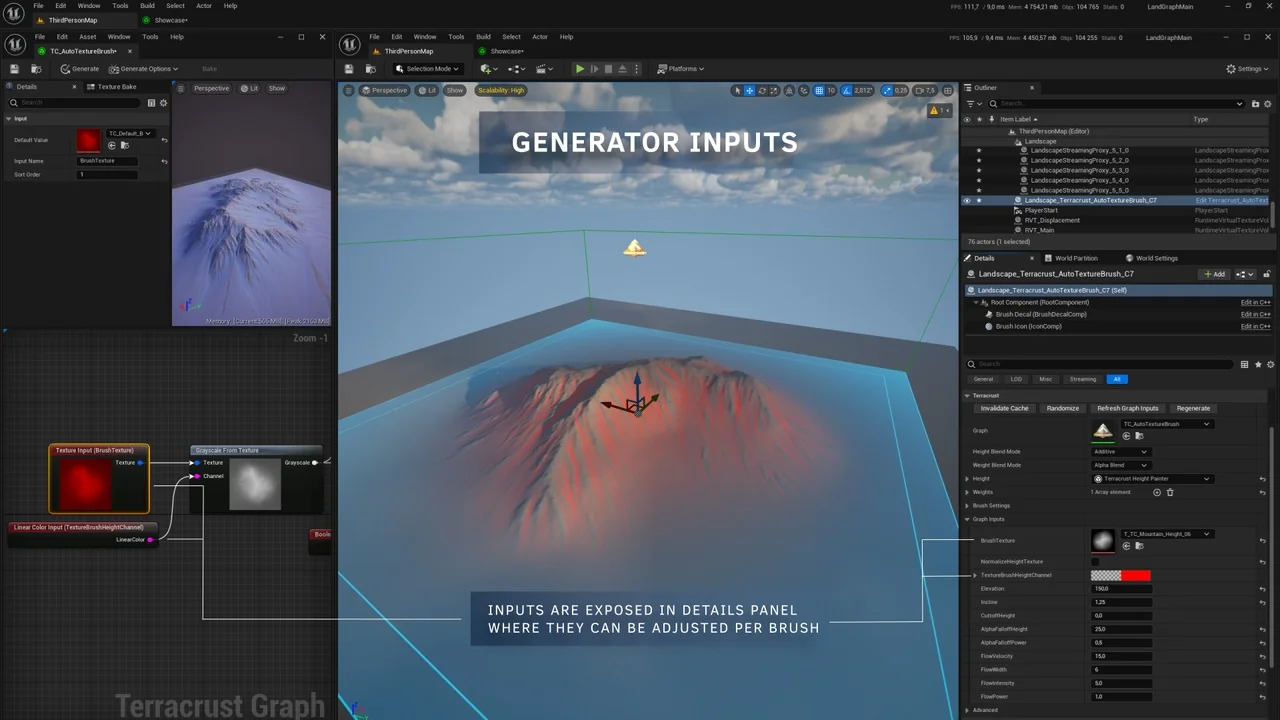 The core of the tool is a custom graph editor. Within this editor, you can create generation logic using a variety of specialized nodes. These nodes generate heightmaps and weightmaps as their primary outputs. Once generated, these outputs apply seamlessly to your landscape via landscape brushes.