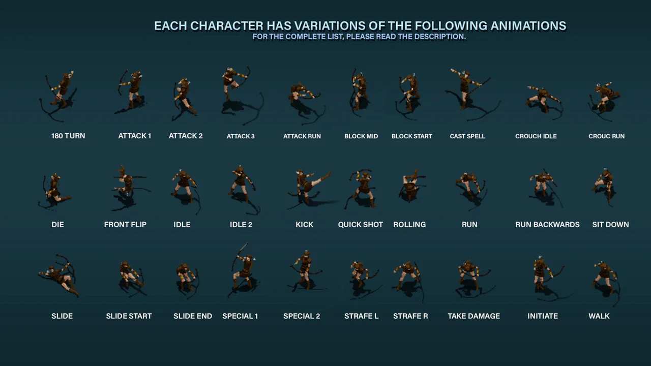 - Over 30 Unique Animations Per Character: Each character comes with a huge set of over 30 distinct animations, covering everything you need for a complex game, including: