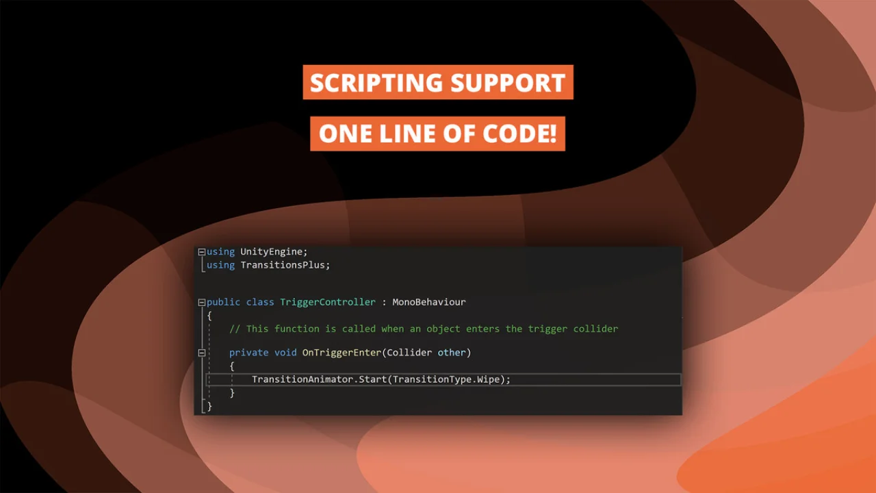 – 3 demo scenes included: a) how to run transitions on demand with one single line of code, b) how to transition between two cameras, c) how to transition from a loading screen to a new scene.