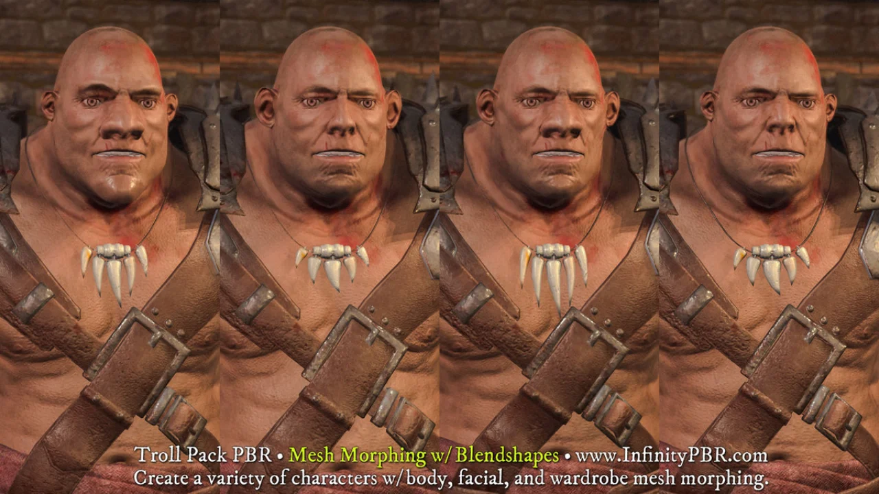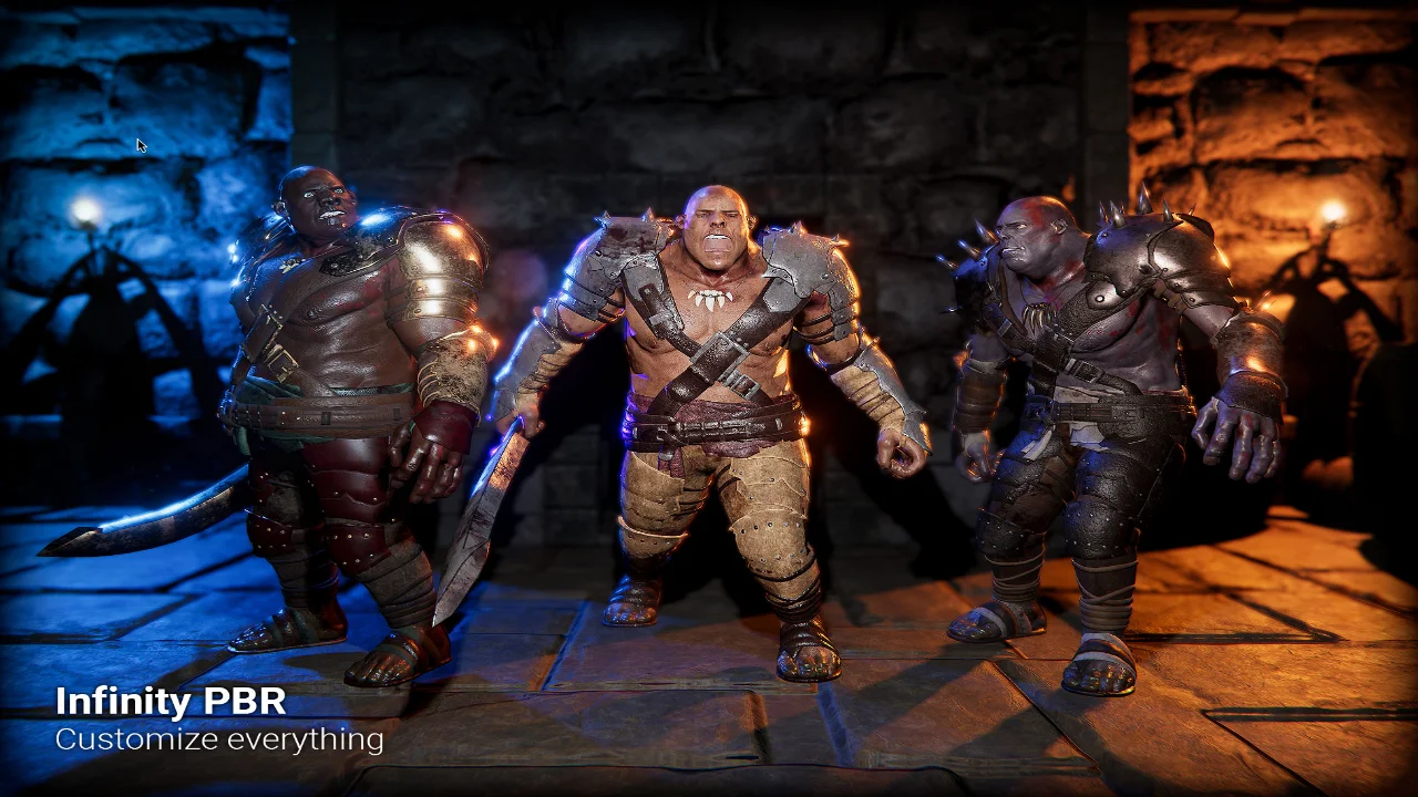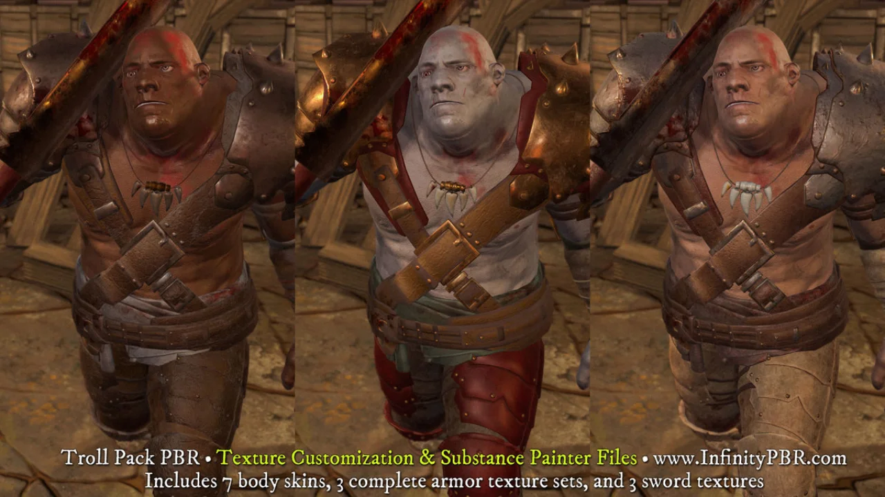 This Troll character comes with a ton of ready-to-use materials — three sword materials, three full armor sets, and 7 body textures. All also come with Substance Painter files so you can customize the textures to fit your game.