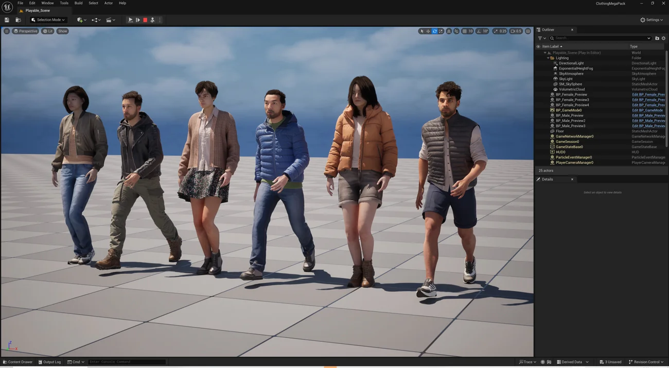 This is not just a folder of separate meshes. The package includes an Unreal project with a character configurator, allowing body type, wardrobe, and hair to be selected through drop-down menus inside UE5. That makes it useful at the stage where a scene needs to be populated quickly, especially when the goal is to avoid repeated faces and outfits across a level.