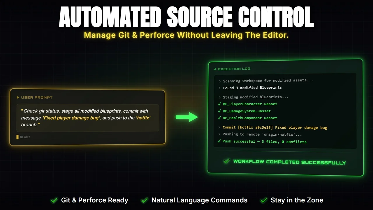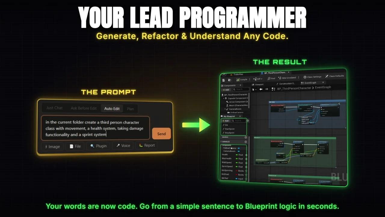 This makes the plugin useful when setup work is slowing down prototyping. Rather than treating the editor as a place to stop and assemble boilerplate by hand, it turns common Blueprint and animation tasks into prompt-driven actions that stay inside the same workflow.