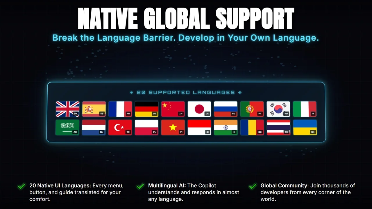 It includes documentation, structured courses, a visual Skill Tree, XP leveling, daily streaks, achievements, and a global leaderboard. The native UI is supported in 20 languages: English, Spanish, French, German, Chinese, Japanese, Russian, Portuguese, Korean, Italian, Arabic, Dutch, Turkish, Polish, Vietnamese, Indonesian, Hindi, Romanian, Thai, and Ukrainian.