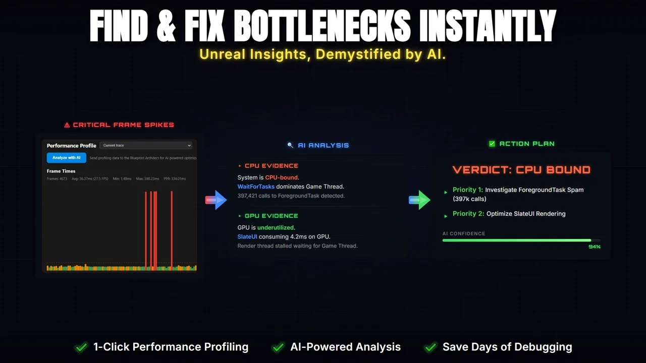 The plugin includes a project scanner that indexes the whole project so deeper architectural questions can be asked of the AI. It can generate visual diagrams in the chat, including dependency graphs, inheritance trees, flowcharts, and pie charts. Unreal Insights profiling is also built in, with one-click performance profiling and AI-driven trace analysis to help identify bottlenecks.