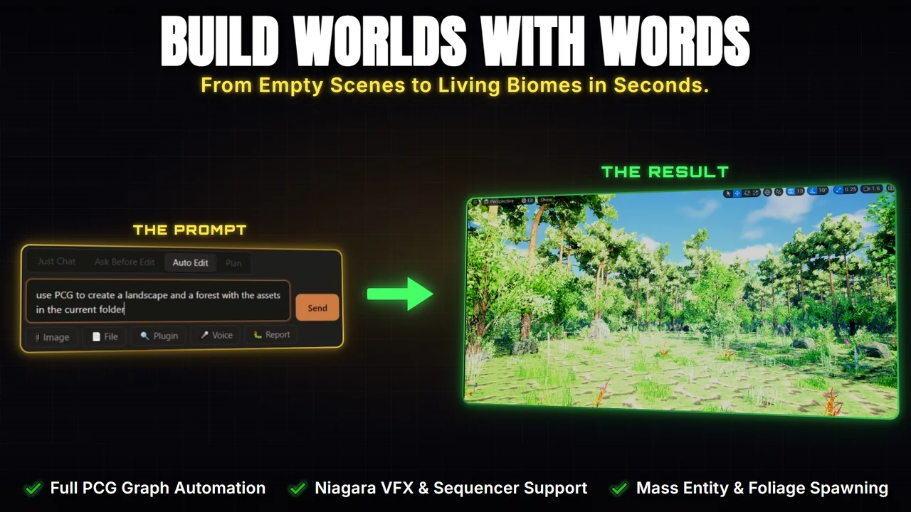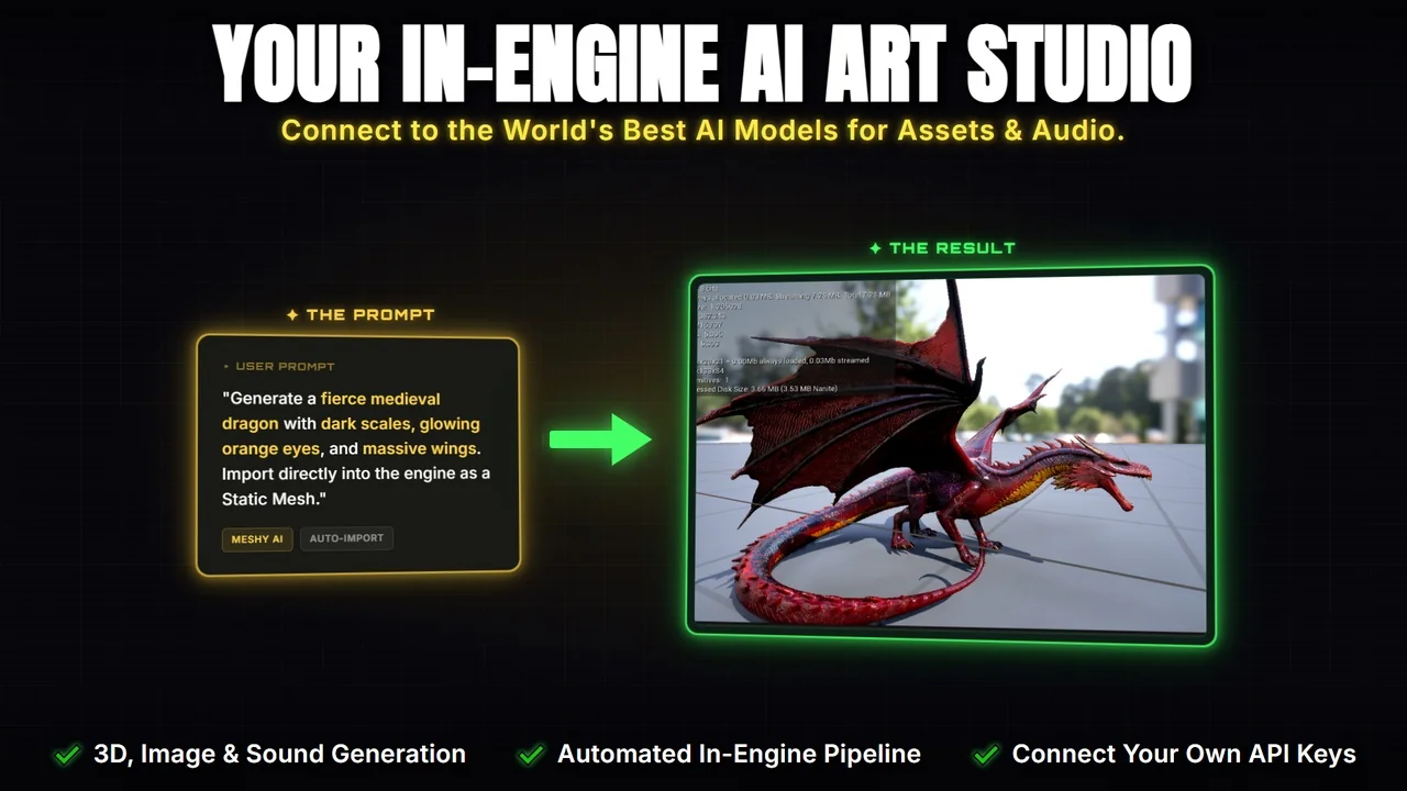 That combination makes it a practical fit for teams that want prompt-based creation, direct editor editing, and AI agents working side by side while the project stays open in Unreal Engine.