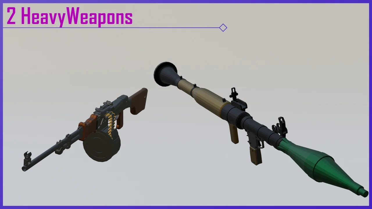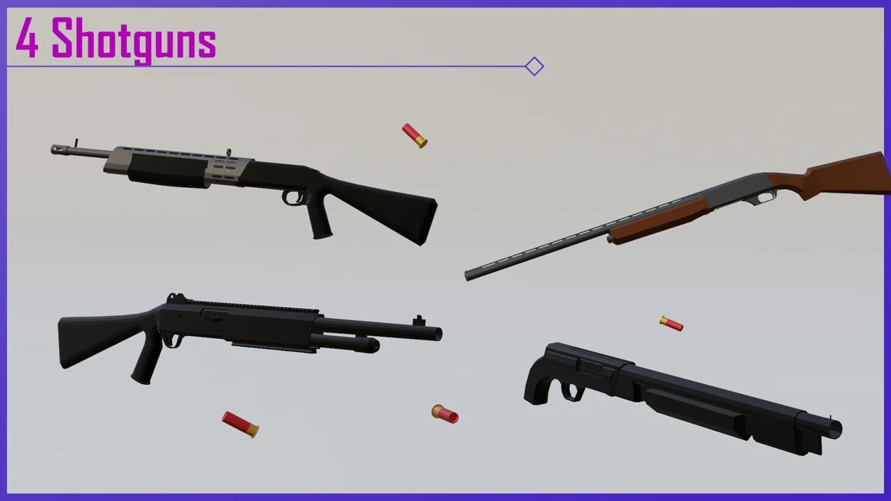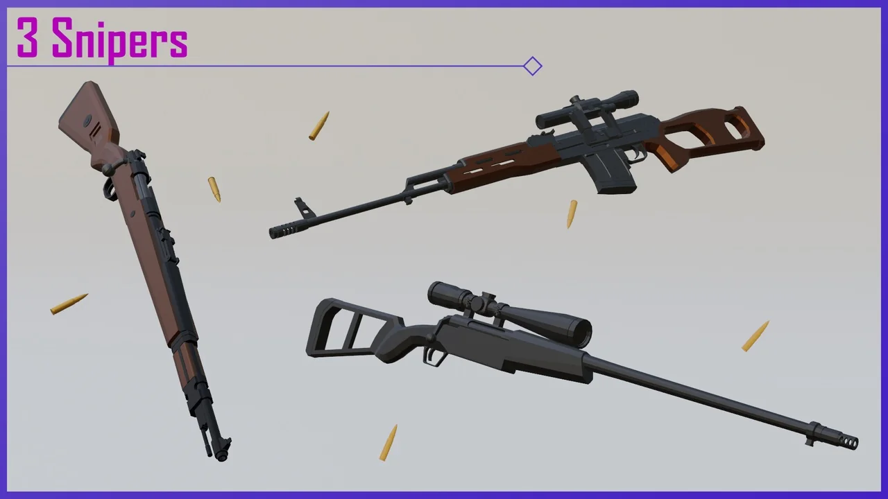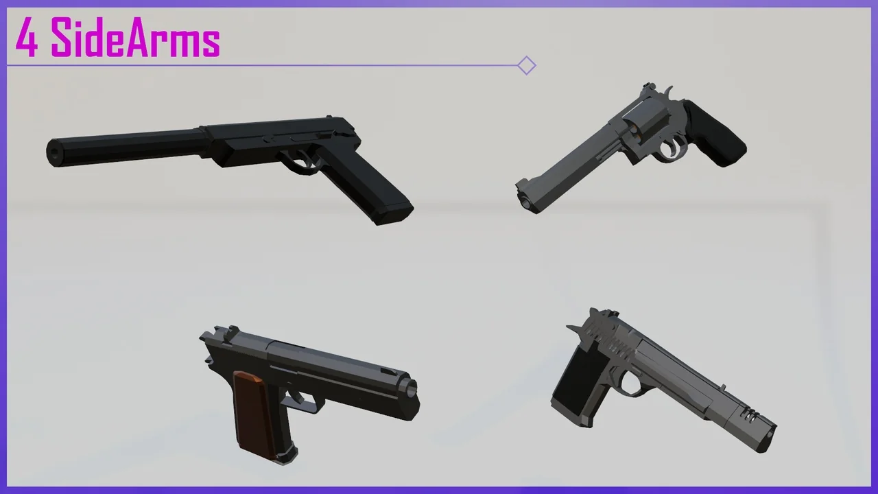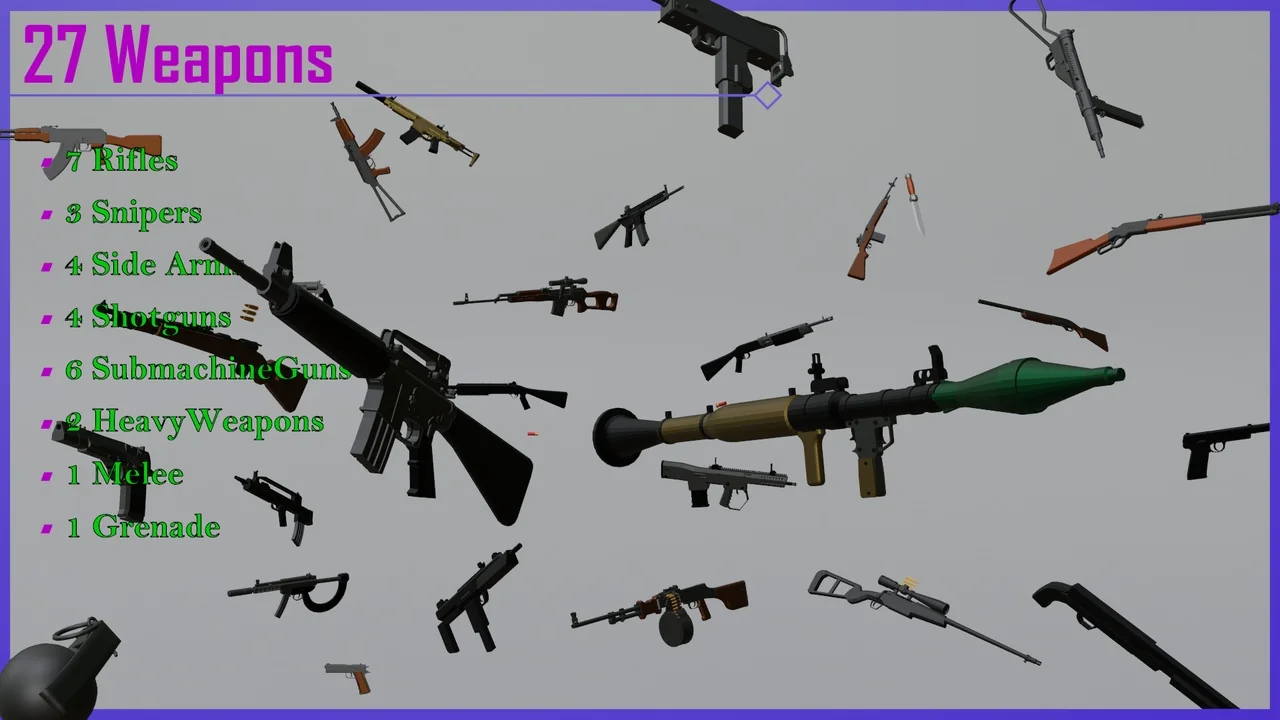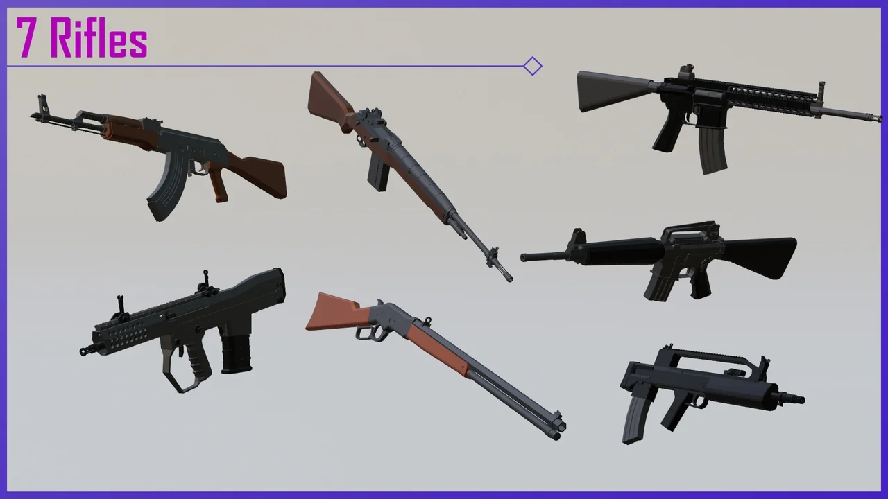 That spread makes the pack broader than a narrow rifle set. It includes rifles, snipers, side arms, shot guns, submachine guns, heavy weapons, melee, and a grenade, so the available weapon types cover several common FPS loadout roles. For a project that needs more than one category of firearm, the selection is already arranged in a way that can support different weapon slots and pacing changes inside a demo or gameplay prototype.