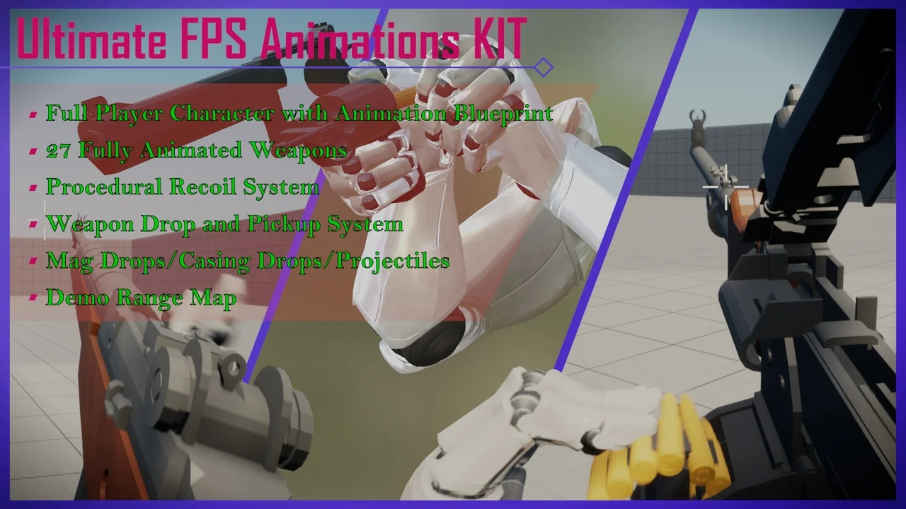 This package fits Unreal Engine projects that need a visible first-person weapon workflow: prototype scenes, gameplay demos, weapon showcases, or internal test setups where motion and interaction matter more than a finished game framework. The included player character and weapon system make it easier to demonstrate the animations in context, while the explicit note that it is not a full out-of-the-box template sets the expectation clearly.