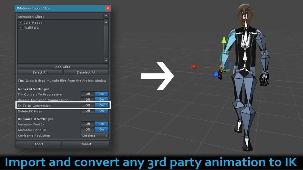 No CPU overhead: UMotion produces Unity animation clips that require no run-time components.