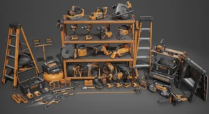 This Power Tools Pack provides a massive collection of customizable handheld tools and industrial equipment. It is an essential resource for artists creating realistic workshops, garages, or construction sites.