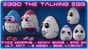 Overview Eggo is a captivating Talking Egg character, featuring two SKM (Skeleton Mesh) versions. The first version is an Epic skeleton, complete with gloves and shoes, while the second version is a jumping egg. Both versions incorporate ARKit morph targets for facial mocap and support the ultimate Easter material. Description