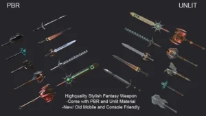 This pack including 5 Sword and 5 Mace that come with Hiqh Quality PBR and Unlit Material. This pack include 10 fantasy stylish melee weapon that come with 2 material set- PBR and Unlit Material (Time to show some love for Low end Mobile) All the assets is this pack
