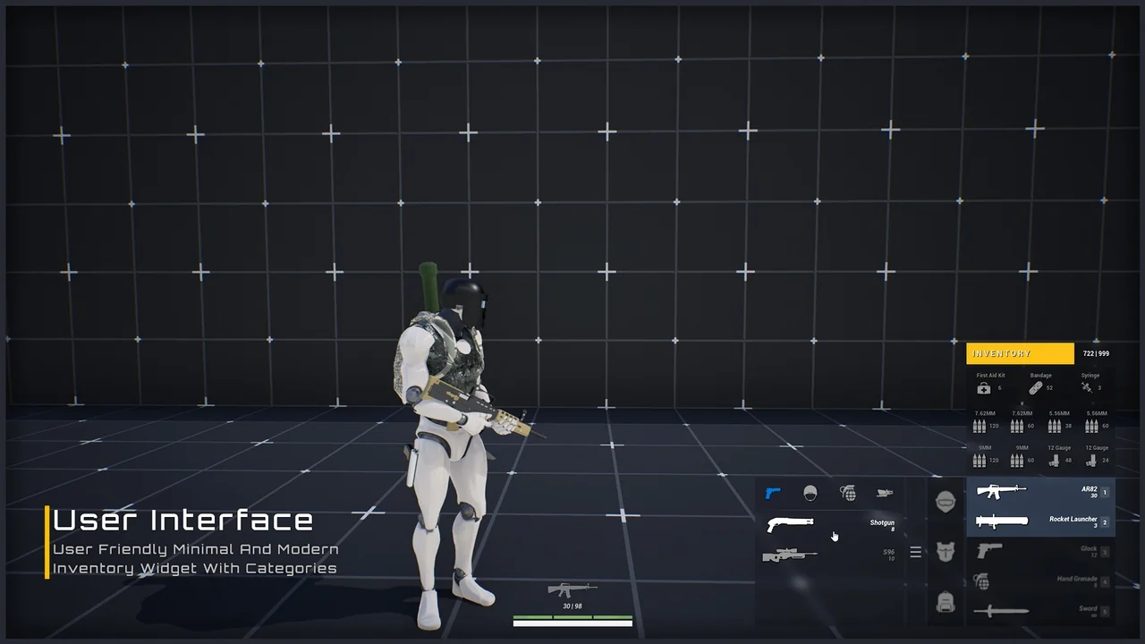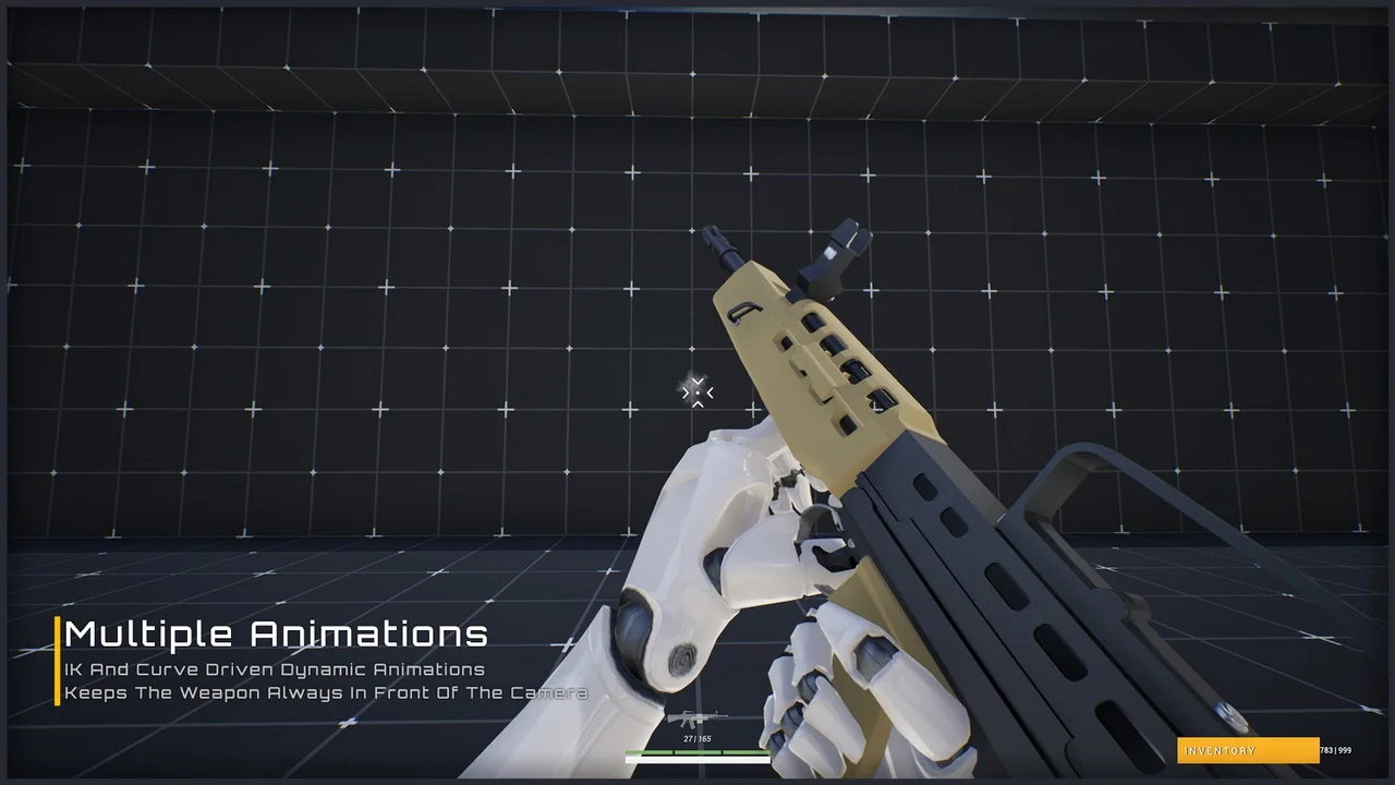 USK: Inventory And Weapon focuses heavily on professional-grade combat mechanics. It features IK-driven Aimdownsights (ADS) to ensure smooth and realistic character animations. In addition, the system includes configurable shooting settings. These settings allow you to adjust how weapons behave during gameplay. For example, you can modify the feel of the combat to match your project’s specific requirements. Therefore, the system provides a high level of control over the user experience.
