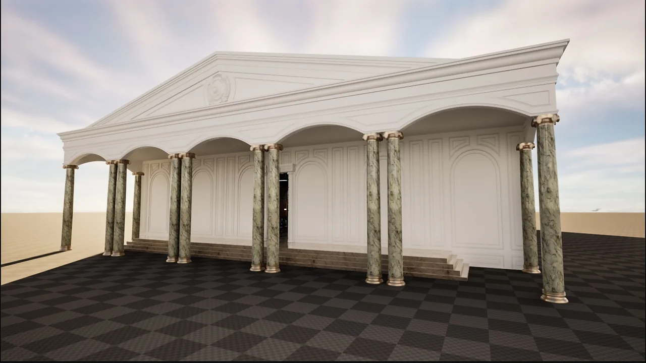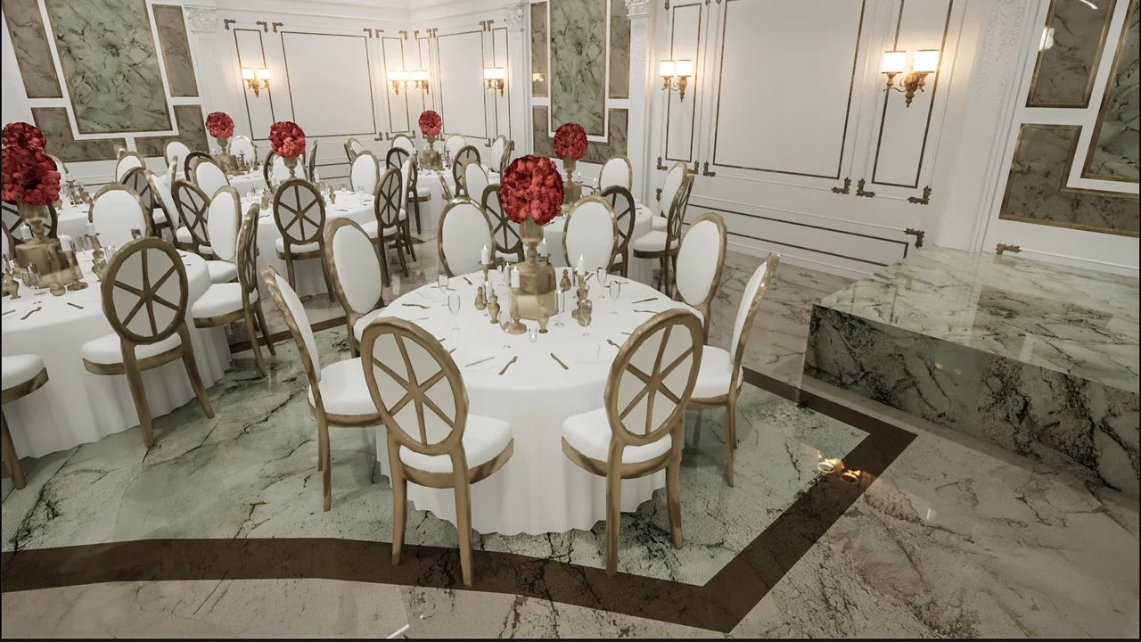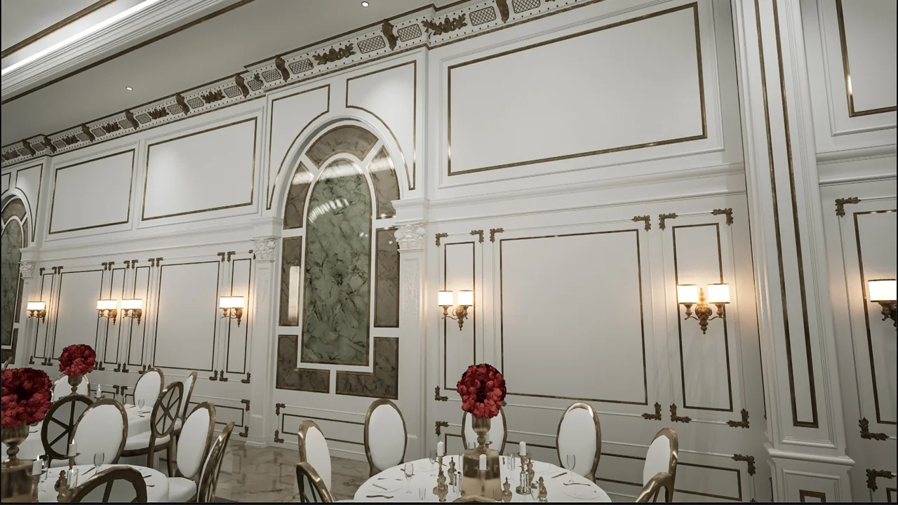 Carefully prepared textures support the hall’s realistic appearance, which is one of the main promises of the environment. In a scene built around ornament, architectural surfaces, and event styling, that preparation is especially relevant. The hall is not just meant to exist as a rough blockout; it is meant to carry a finished visual impression.