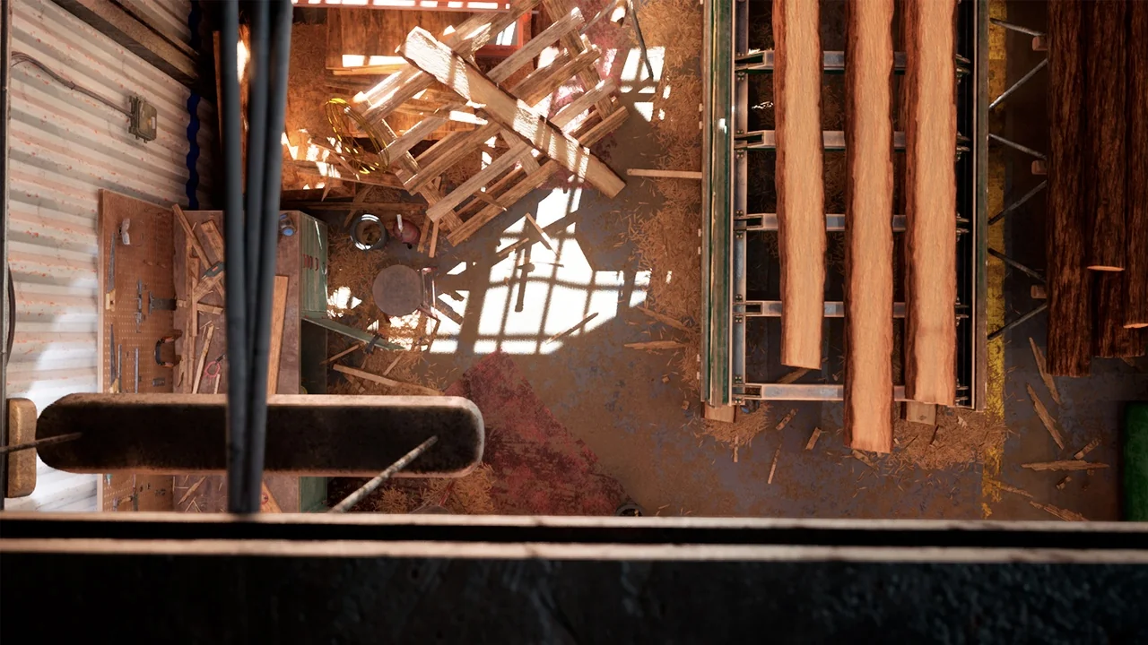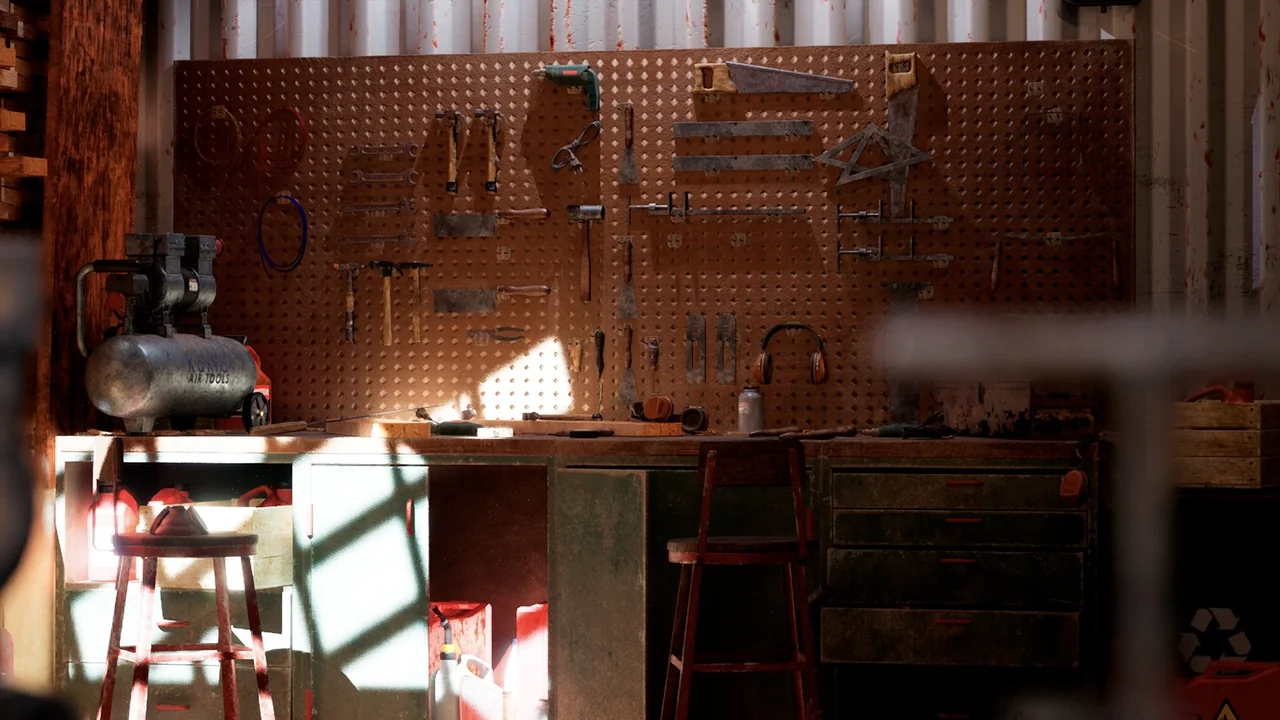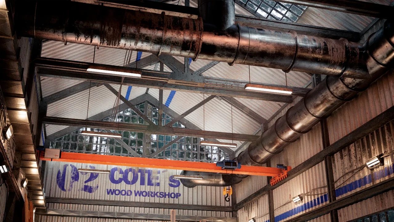 Moreover, the environment blends practicality with a sleek aesthetic. It features exposed beams, metal fixtures, and natural wooden surfaces. Therefore, it is ideal for both novice and experienced digital creators. The neutral palette of grays and blacks creates a professional atmosphere. Additionally, bright safety colors highlight essential tools for better visibility.